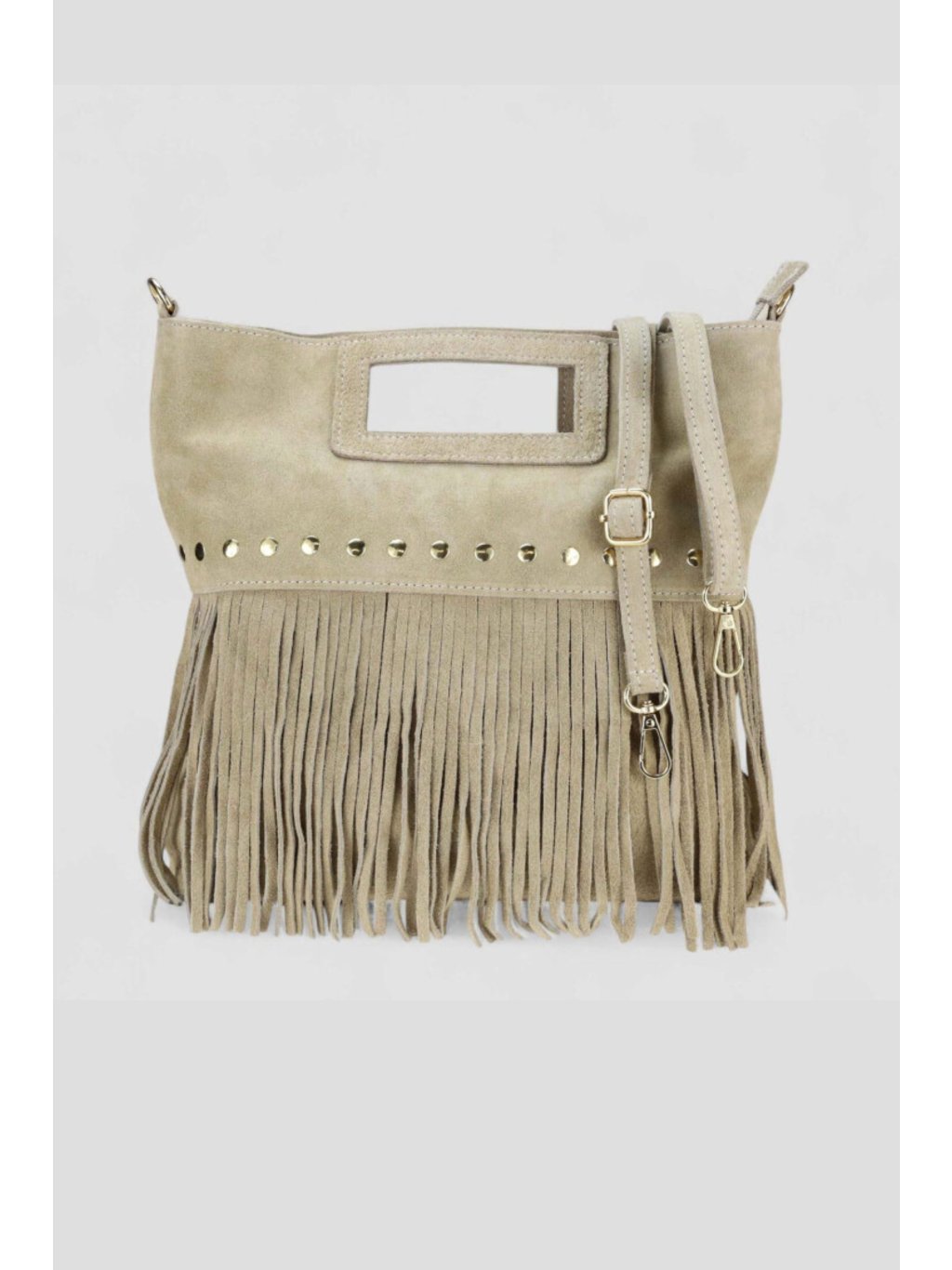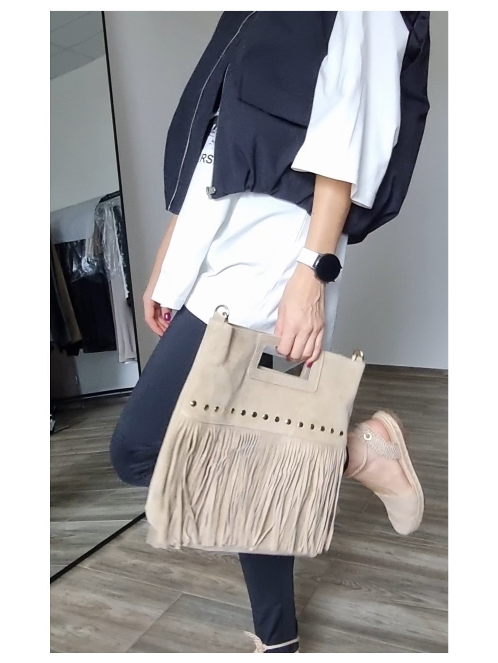 Design s třásněmi a zlatými cvoky dodává boho nádech, zatímco nastavitelný popruh z broušené kůže umožňuje pohodlné nošení přes rameno.