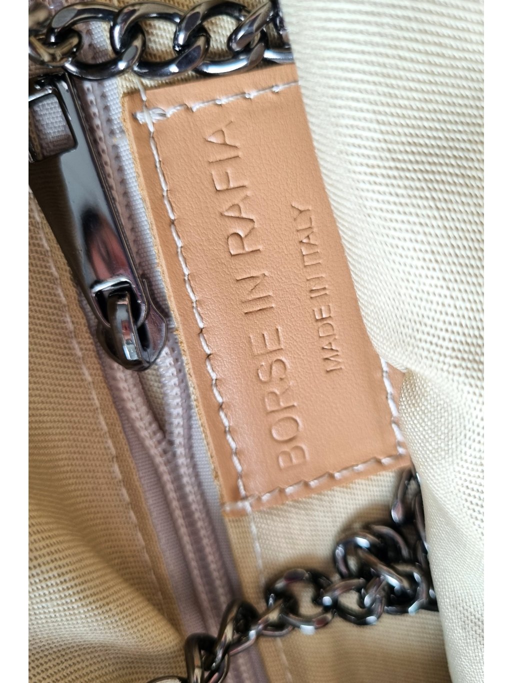 Uvnitř je pevná textilní podšívka (lining), která chrání obsah a zachovává tvar kabelky.