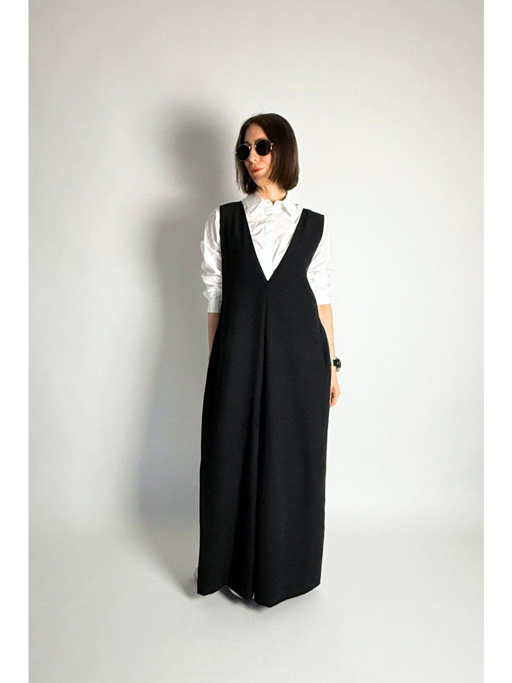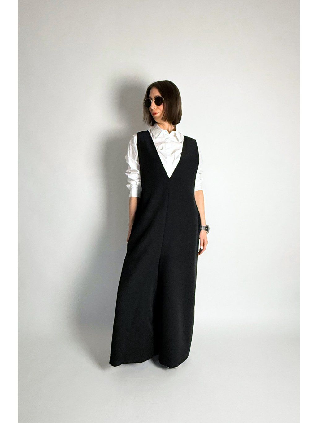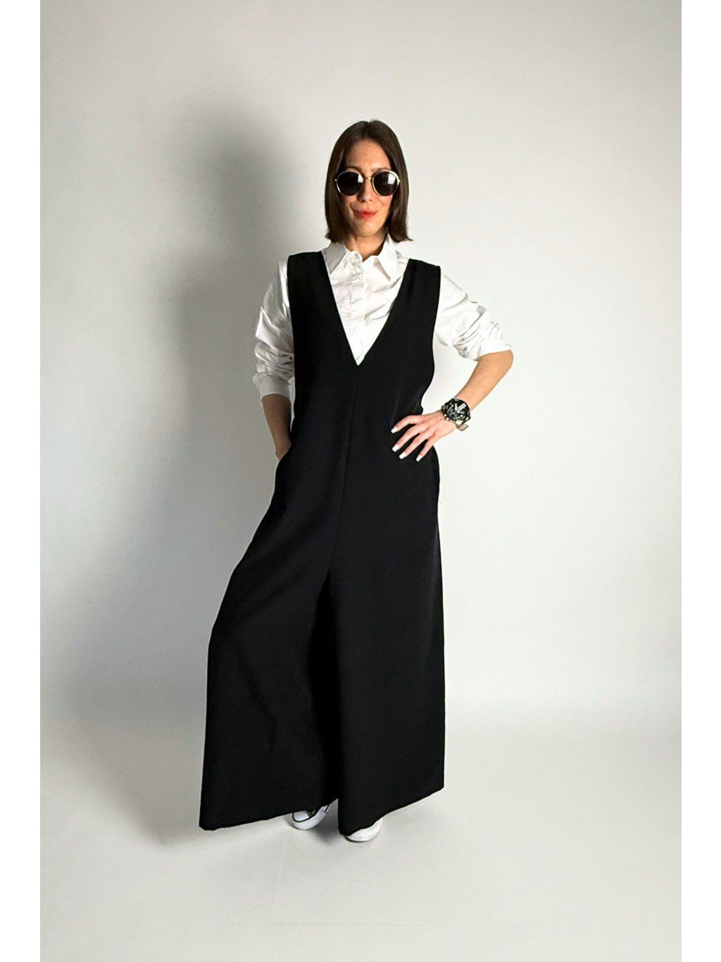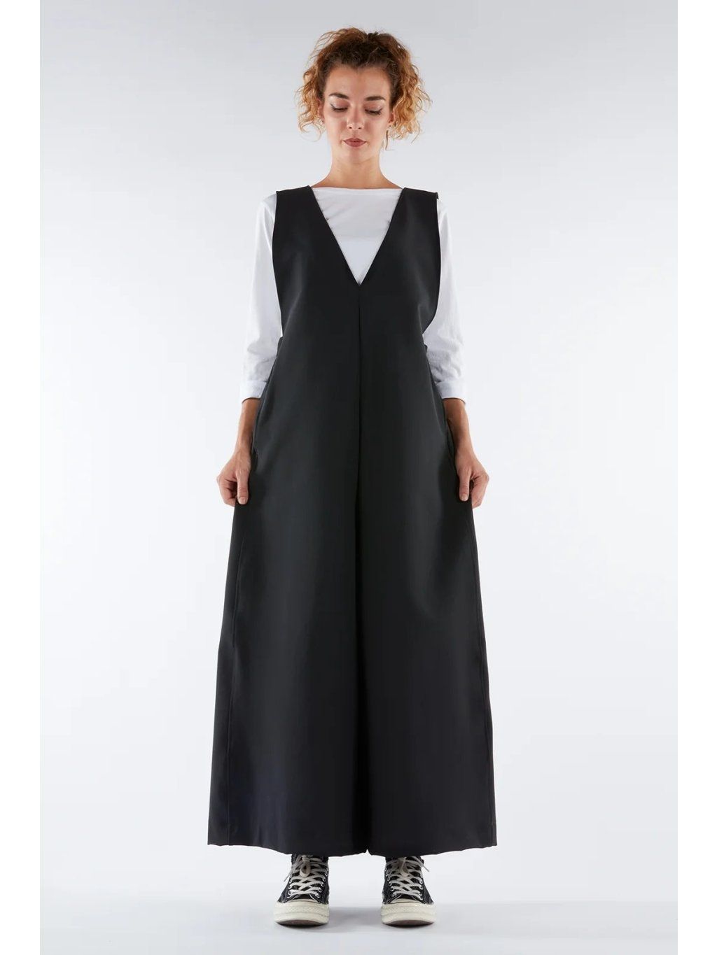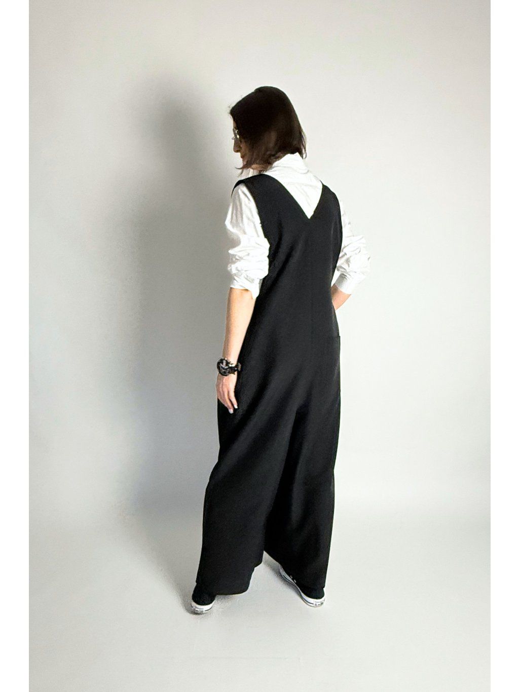 Pohodlný oversize overal s výrazným výstřihem do „V“ na přední i zadní straně.
