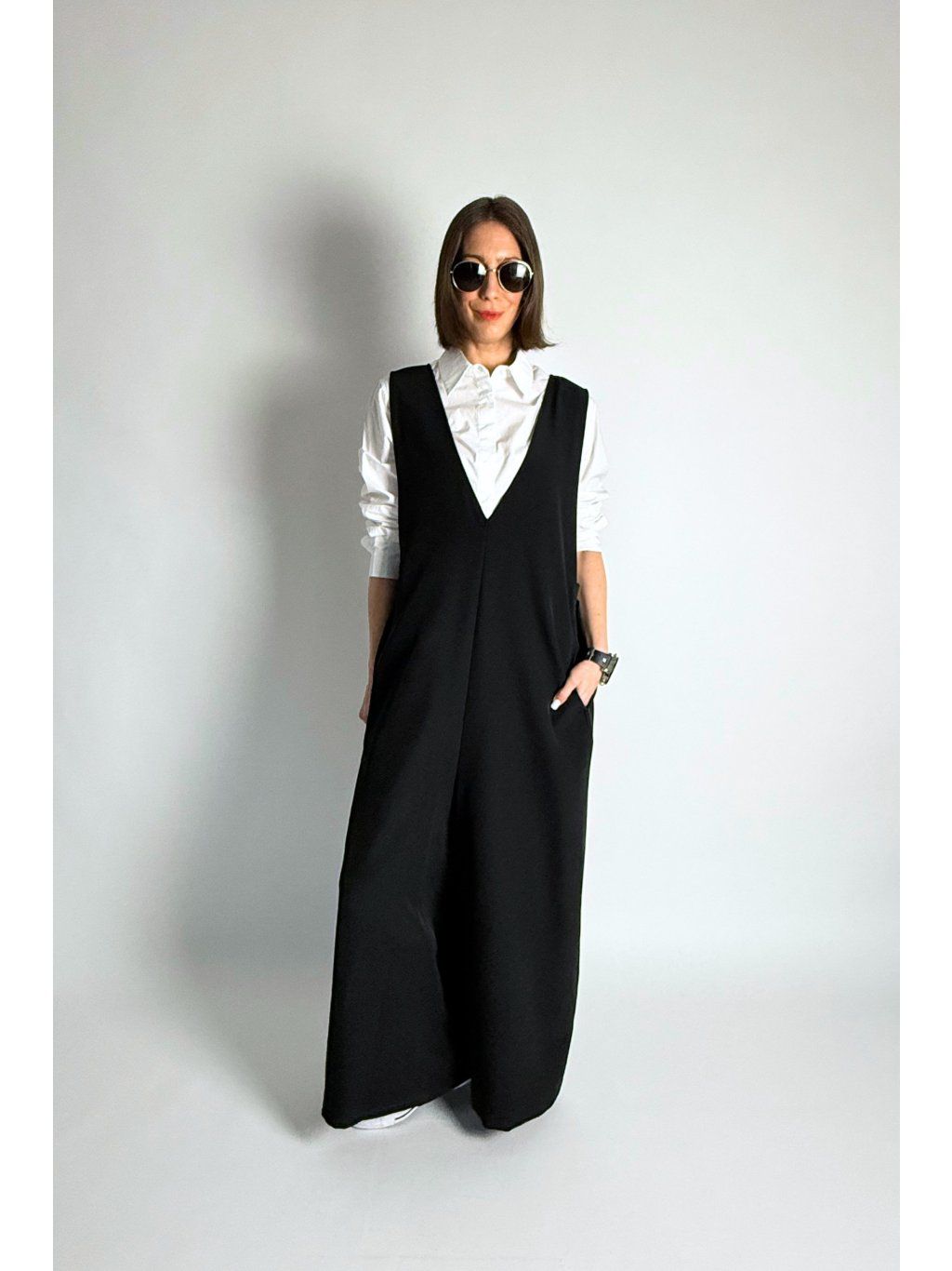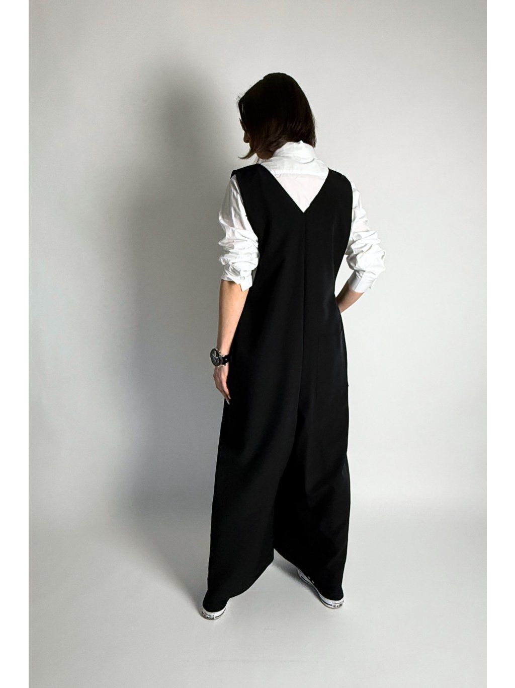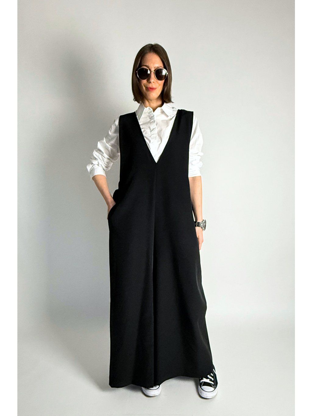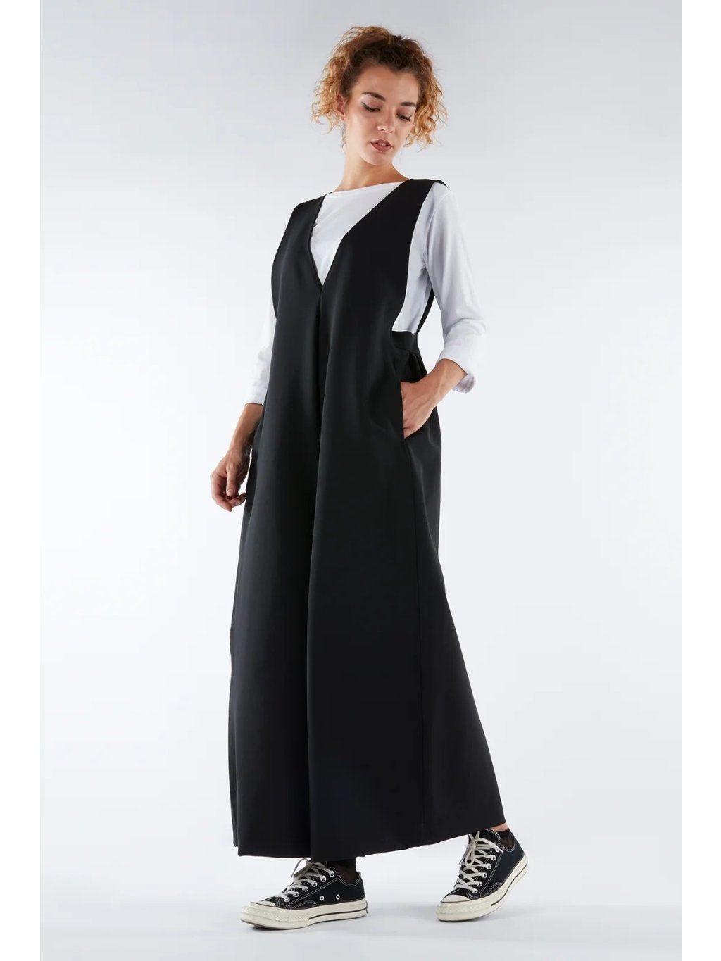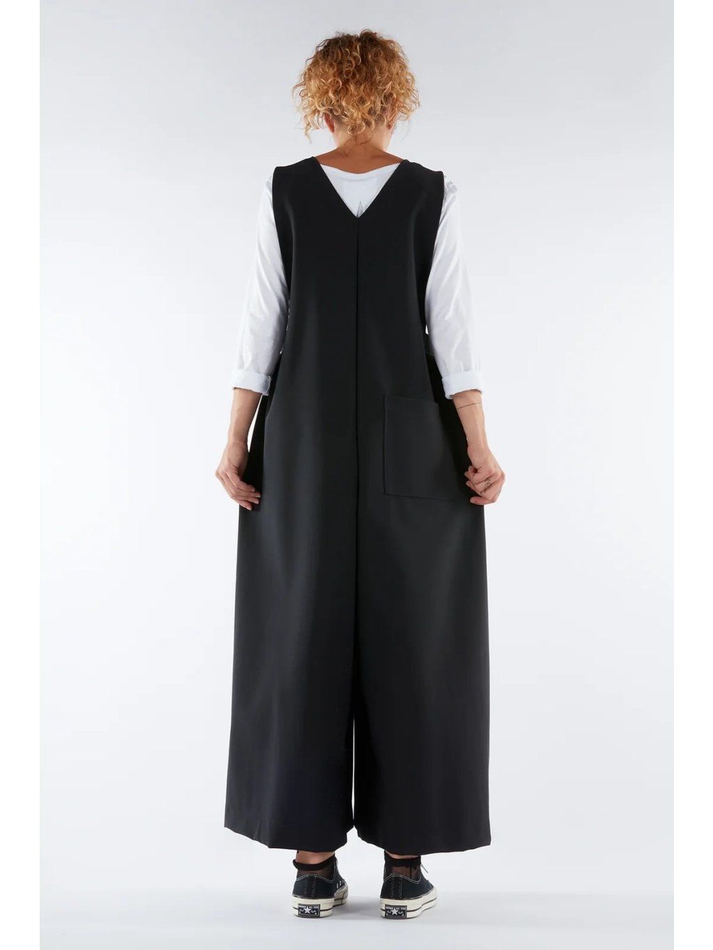 Pohodlný oversize overal s výrazným výstřihem do „V“ na přední i zadní straně.
