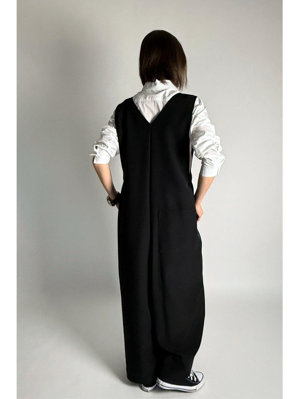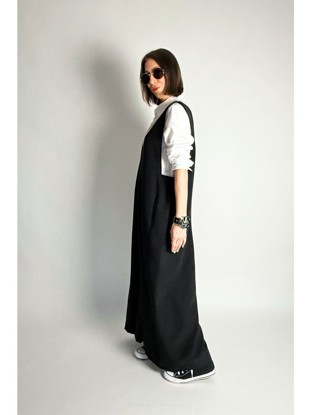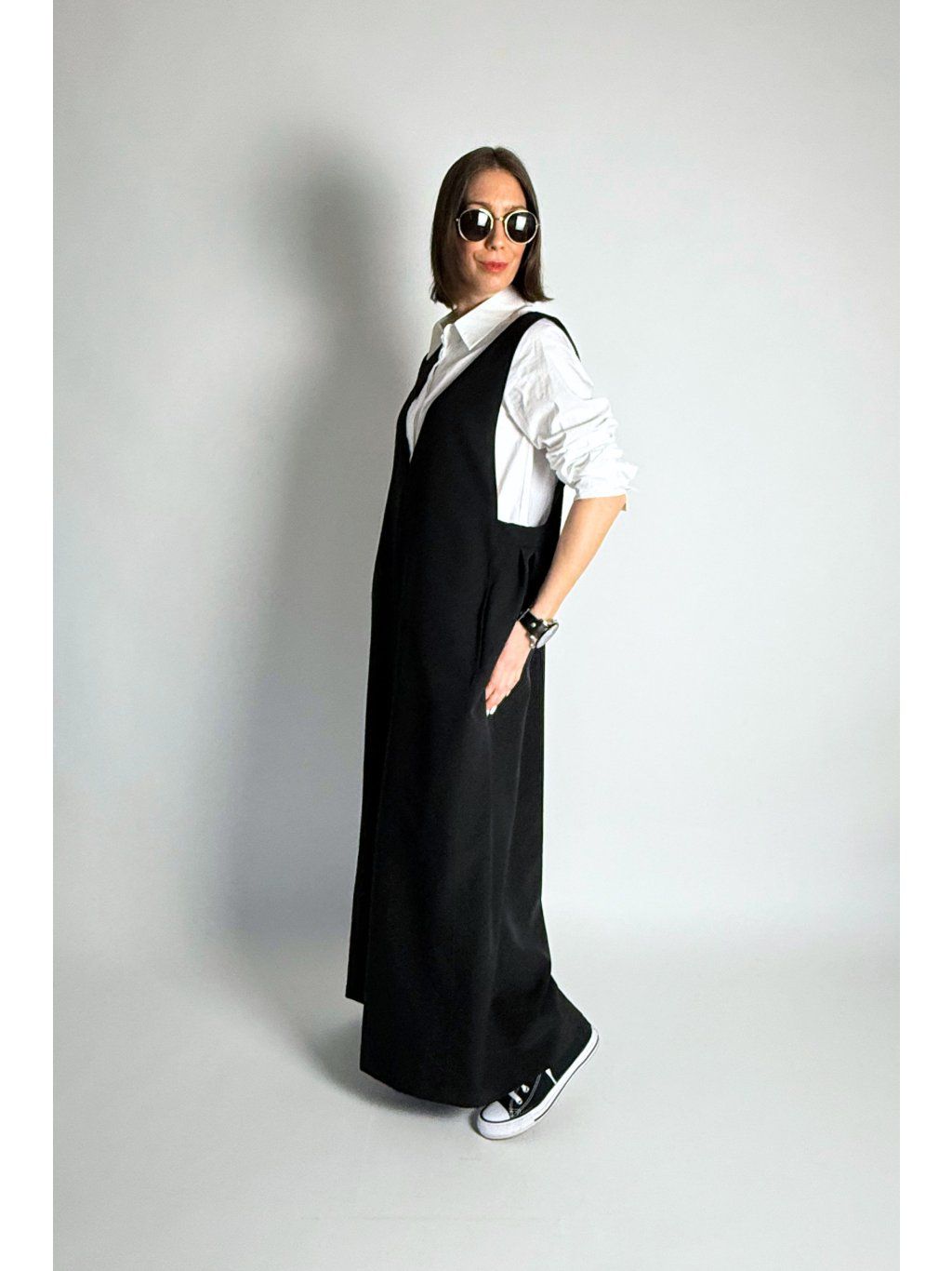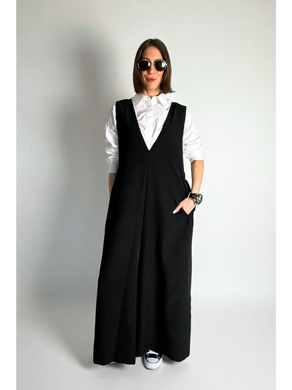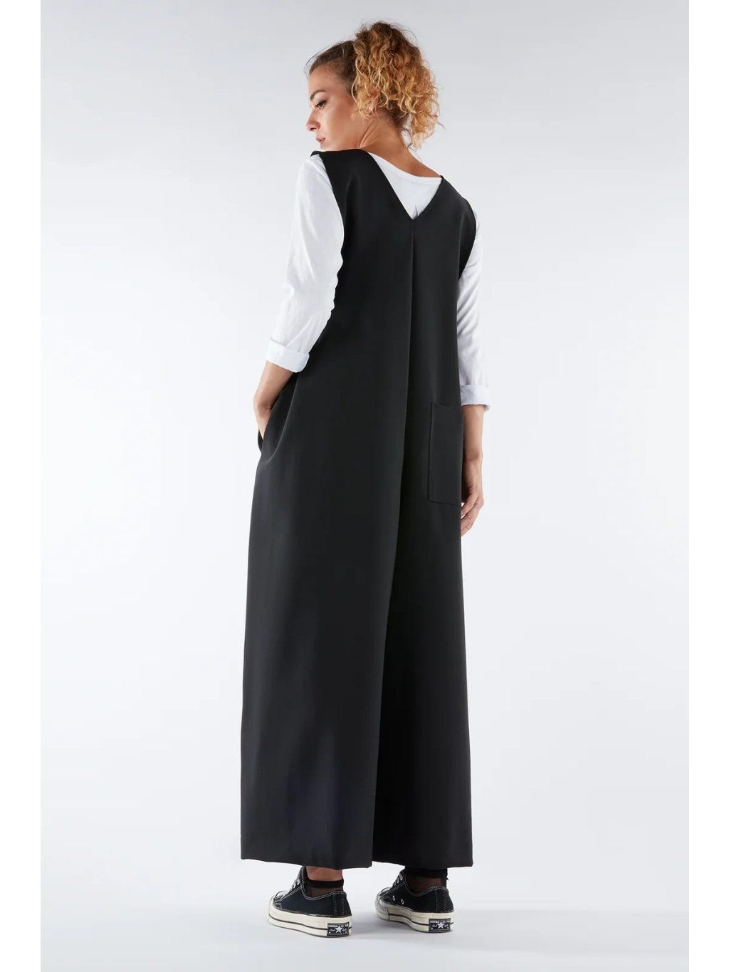 Pohodlný oversize overal s výrazným výstřihem do „V“ na přední i zadní straně.