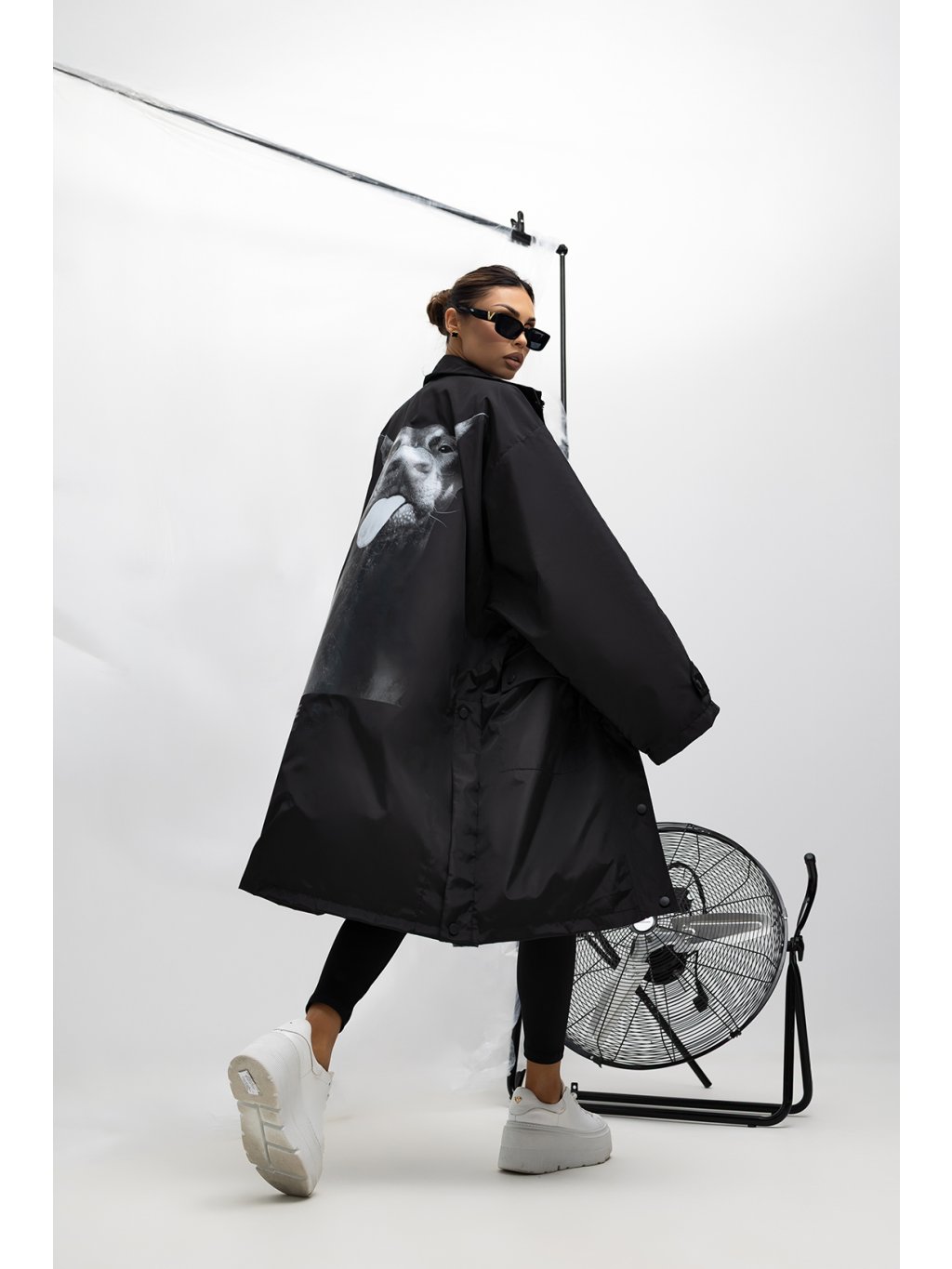 Kabát má dvě kapsy vpředu s klopami na cvok