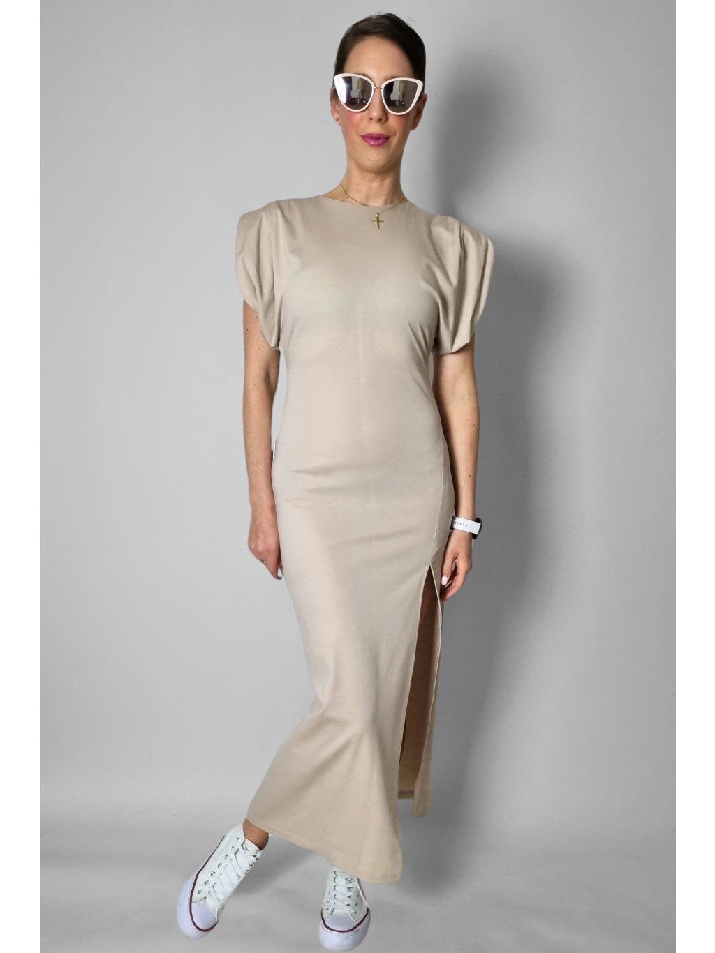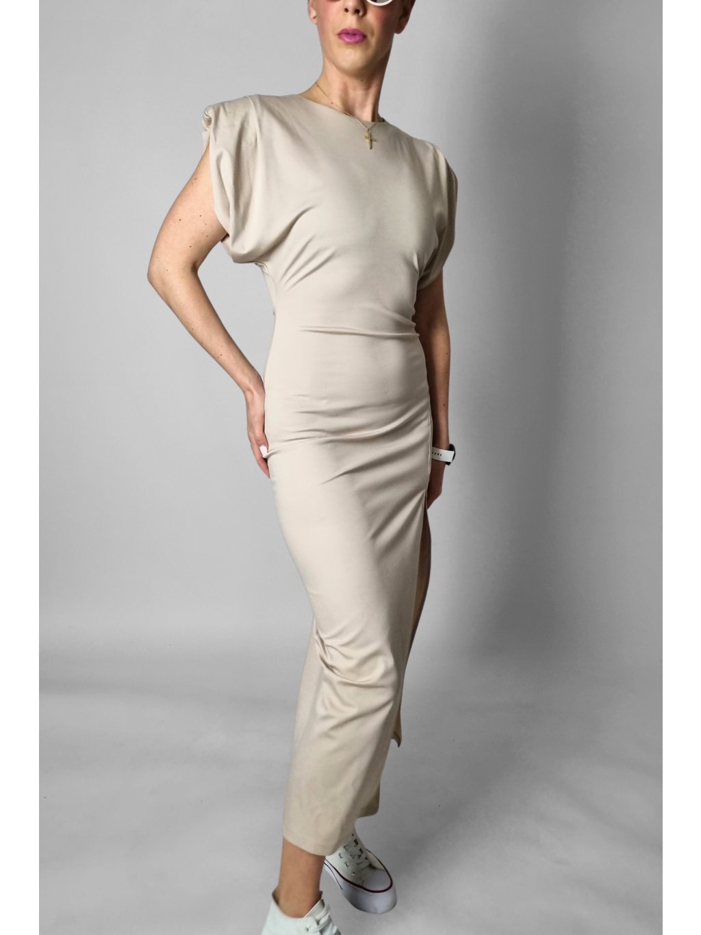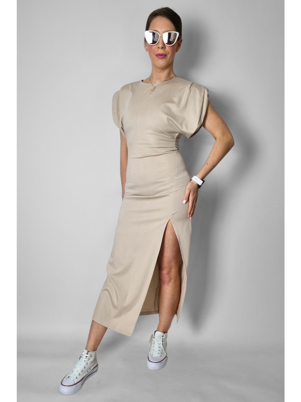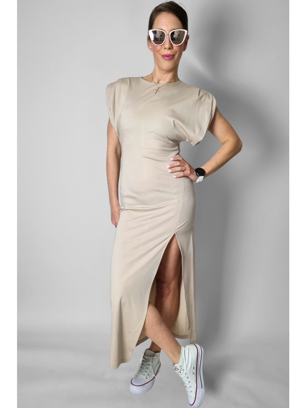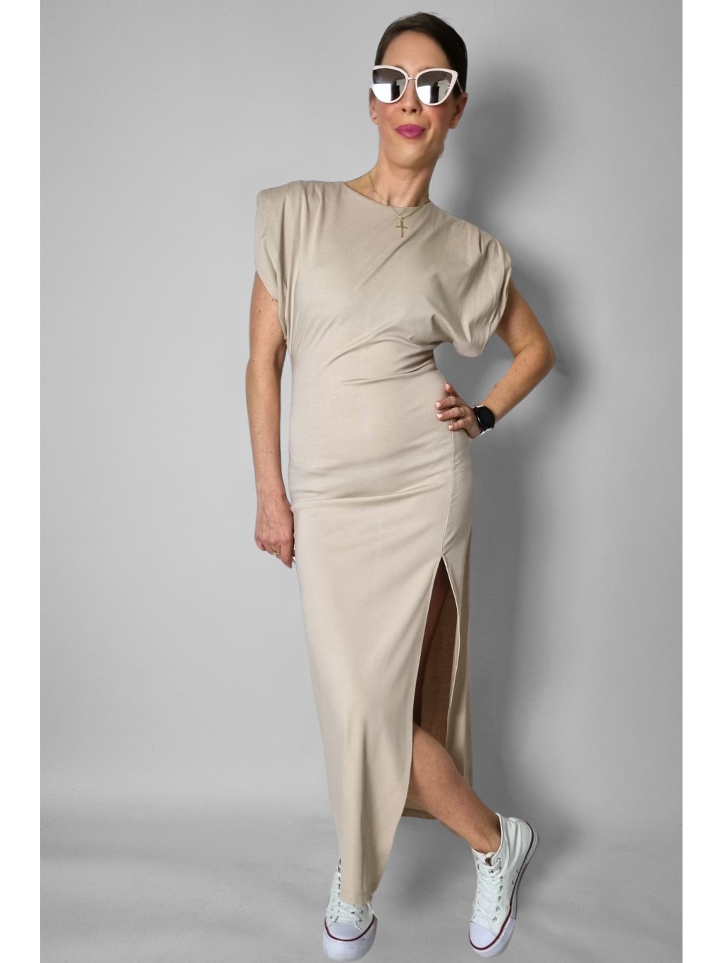 · Velikost UNI - odpovídá velikosti S/M/L · Vycpávky na rameni · Na zádech zip · Šaty jsou pružné a lze je nosit dle individuálních potřeb · Krátký rukáv · 1x rozparek · Barva: Béžová · Střih : Rovný | užší pas | sukýnka s rozparekem | široké rukávy · Vzor: Lehké šaty s rozparkem · Roční období: Jaro, léto, podzim · Značka: Lumina – Made in Italy Rozměry: Šířka přes prsa: 50 cm Šířka pas: 34 cm Šířka přes boky: 43 cm Celková délka: 134 cm Délka rozparku: 60 cm Složení: 65% Viskoza 29% Polyamid 6% Elastan