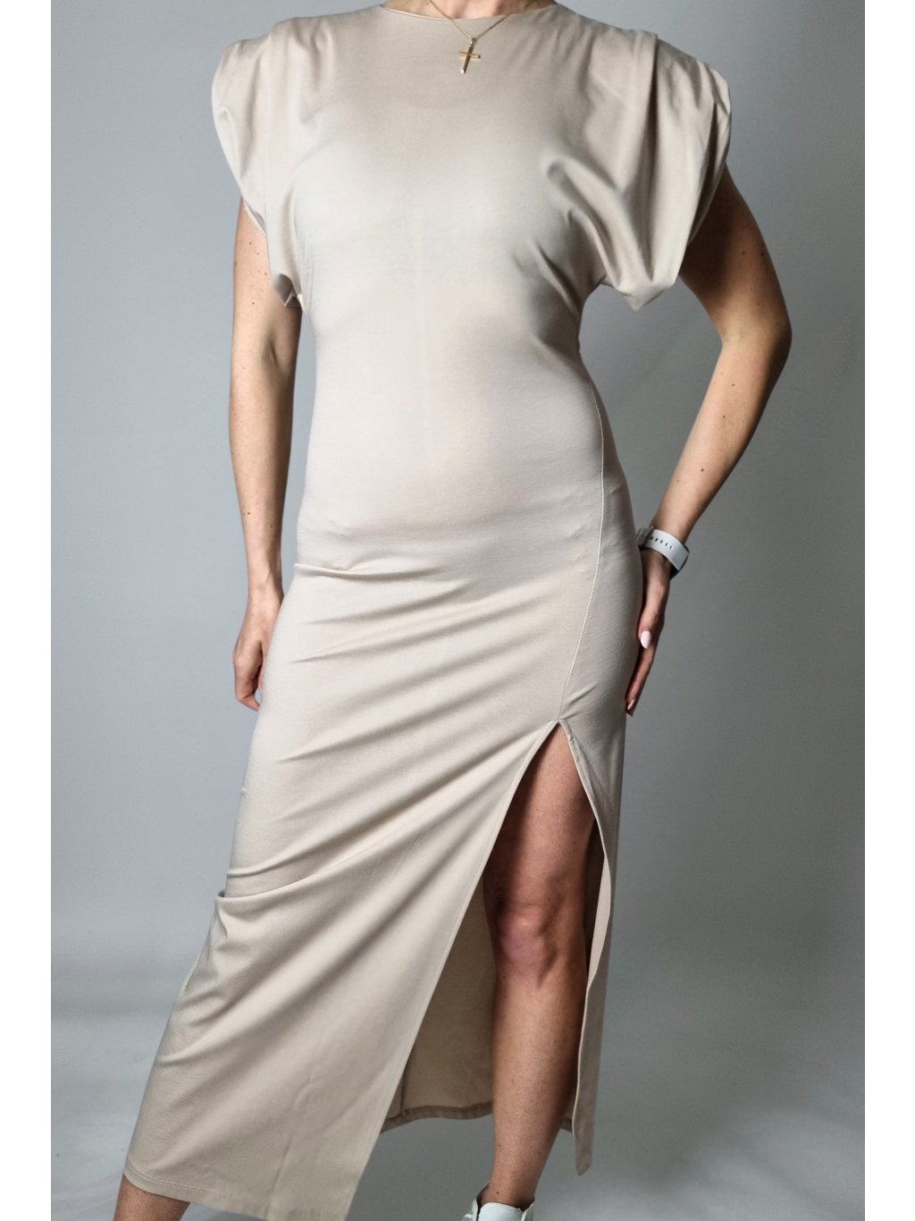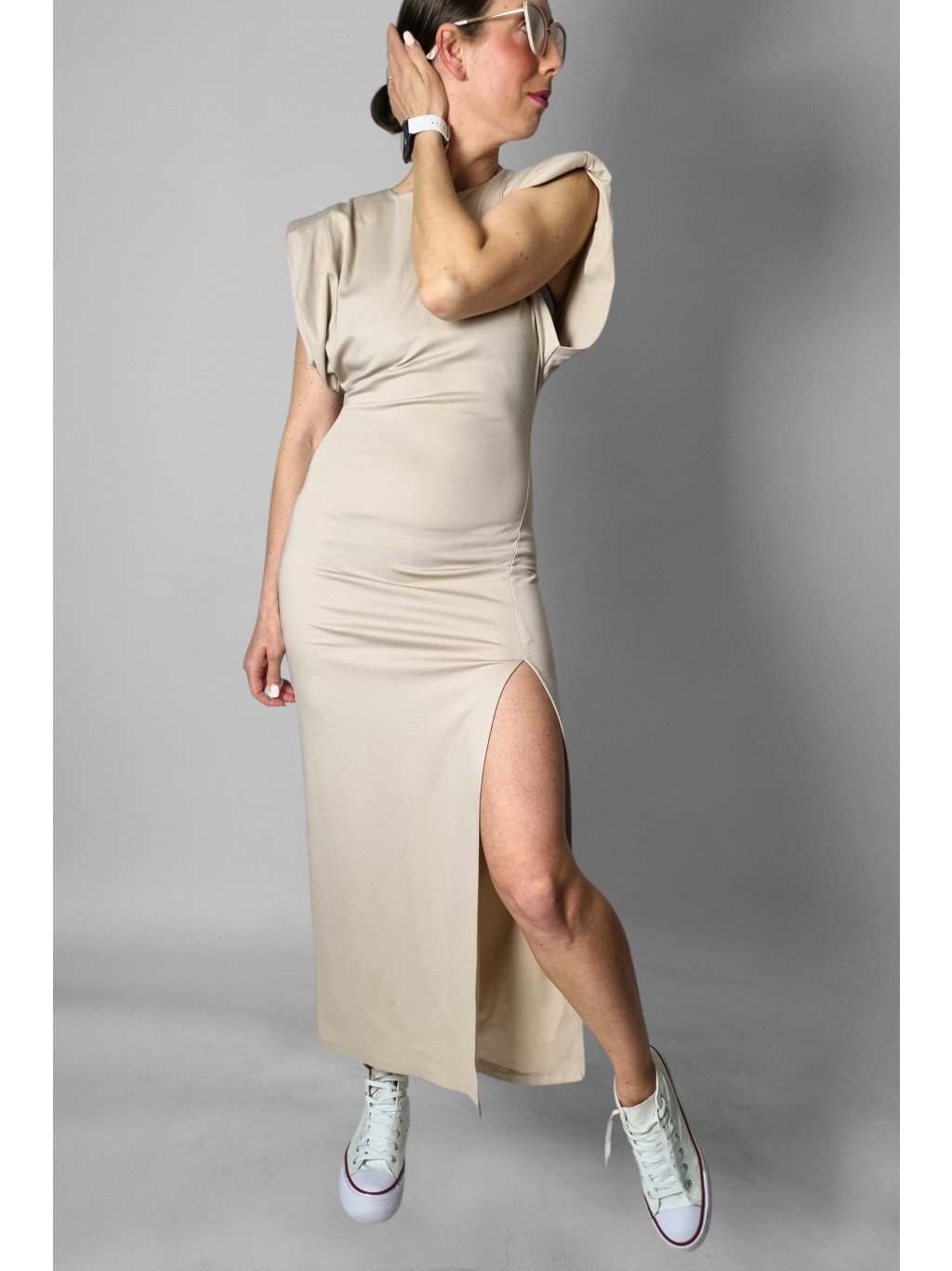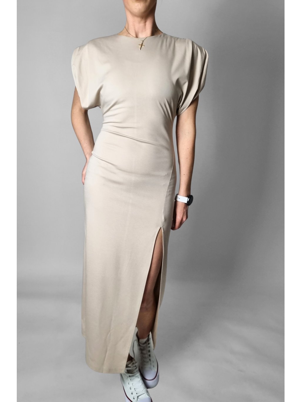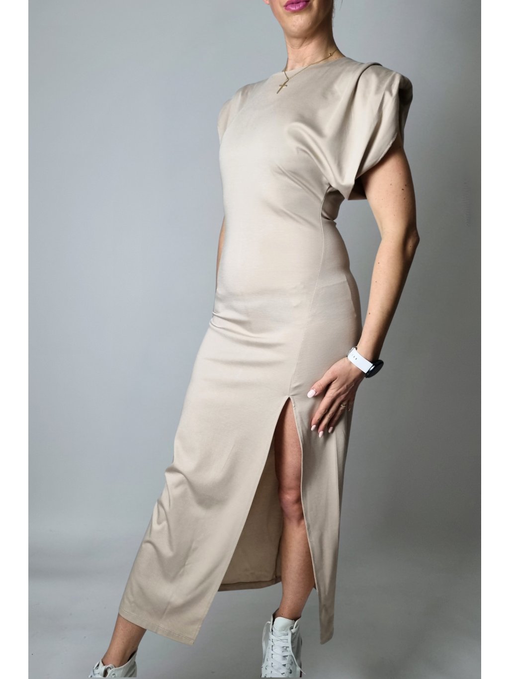 · Velikost UNI - odpovídá velikosti S/M/L · Vycpávky na rameni · Na zádech zip · Šaty jsou pružné a lze je nosit dle individuálních potřeb · Krátký rukáv · 1x rozparek · Barva: Béžová · Střih : Rovný | užší pas | sukýnka s rozparekem | široké rukávy · Vzor: Lehké šaty s rozparkem · Roční období: Jaro, léto, podzim · Značka: Lumina – Made in Italy Rozměry: Šířka přes prsa: 50 cm Šířka pas: 34 cm Šířka přes boky: 43 cm Celková délka: 134 cm Délka rozparku: 60 cm Složení: 65% Viskoza 29% Polyamid 6% Elastan