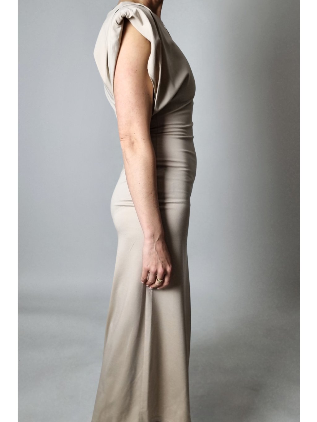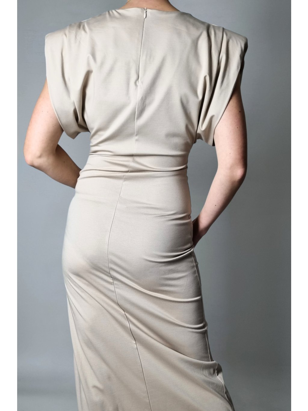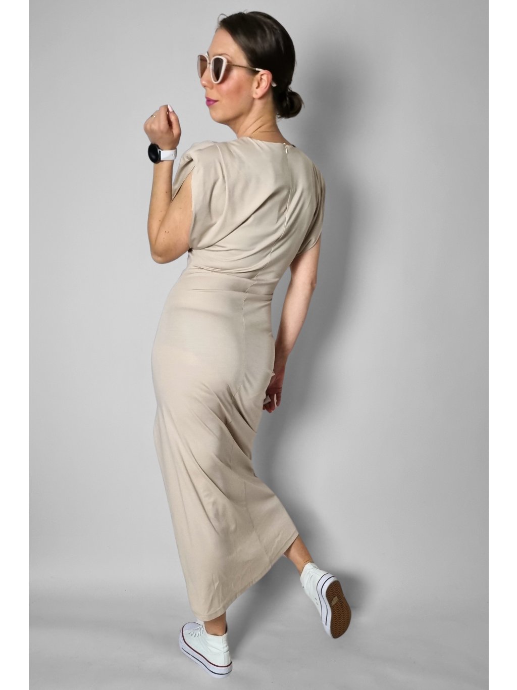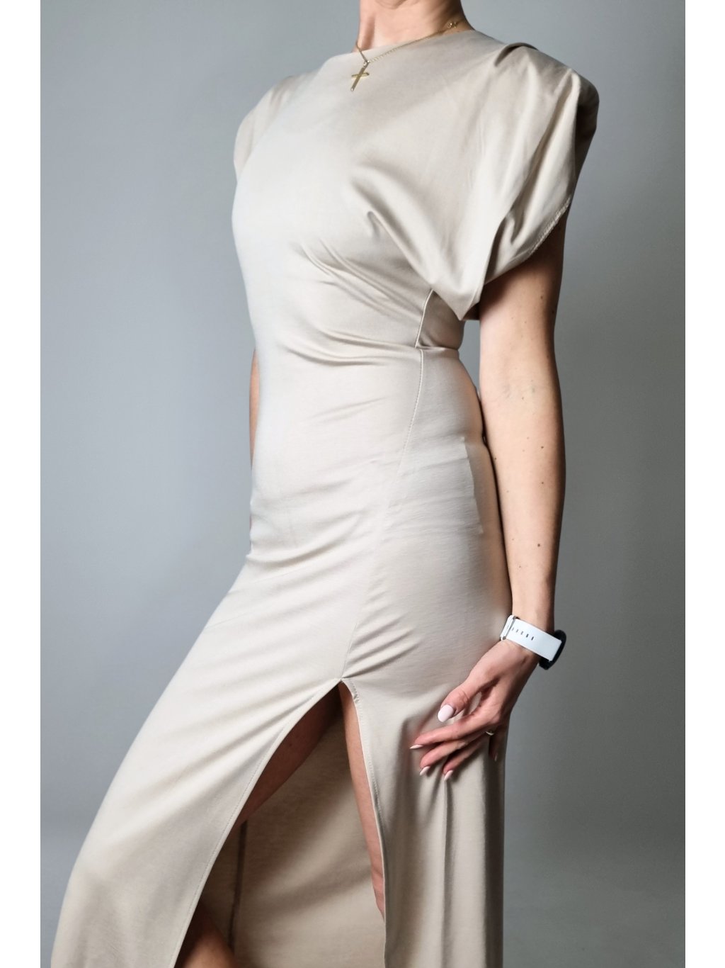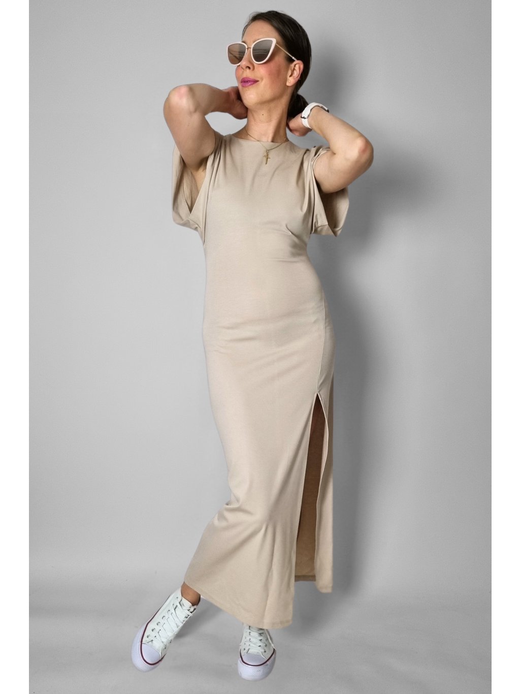 · Velikost UNI - odpovídá velikosti S/M/L · Vycpávky na rameni · Na zádech zip · Šaty jsou pružné a lze je nosit dle individuálních potřeb · Krátký rukáv · 1x rozparek · Barva: Béžová · Střih : Rovný | užší pas | sukýnka s rozparekem | široké rukávy · Vzor: Lehké šaty s rozparkem · Roční období: Jaro, léto, podzim · Značka: Lumina – Made in Italy Rozměry: Šířka přes prsa: 50 cm Šířka pas: 34 cm Šířka přes boky: 43 cm Celková délka: 134 cm Délka rozparku: 60 cm Složení: 65% Viskoza 29% Polyamid 6% Elastan