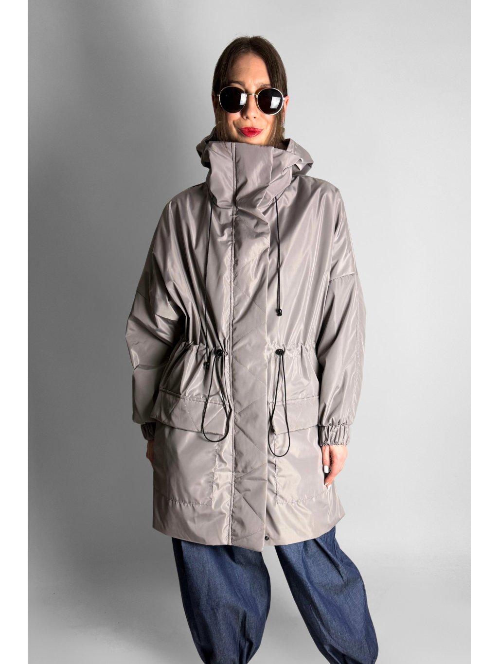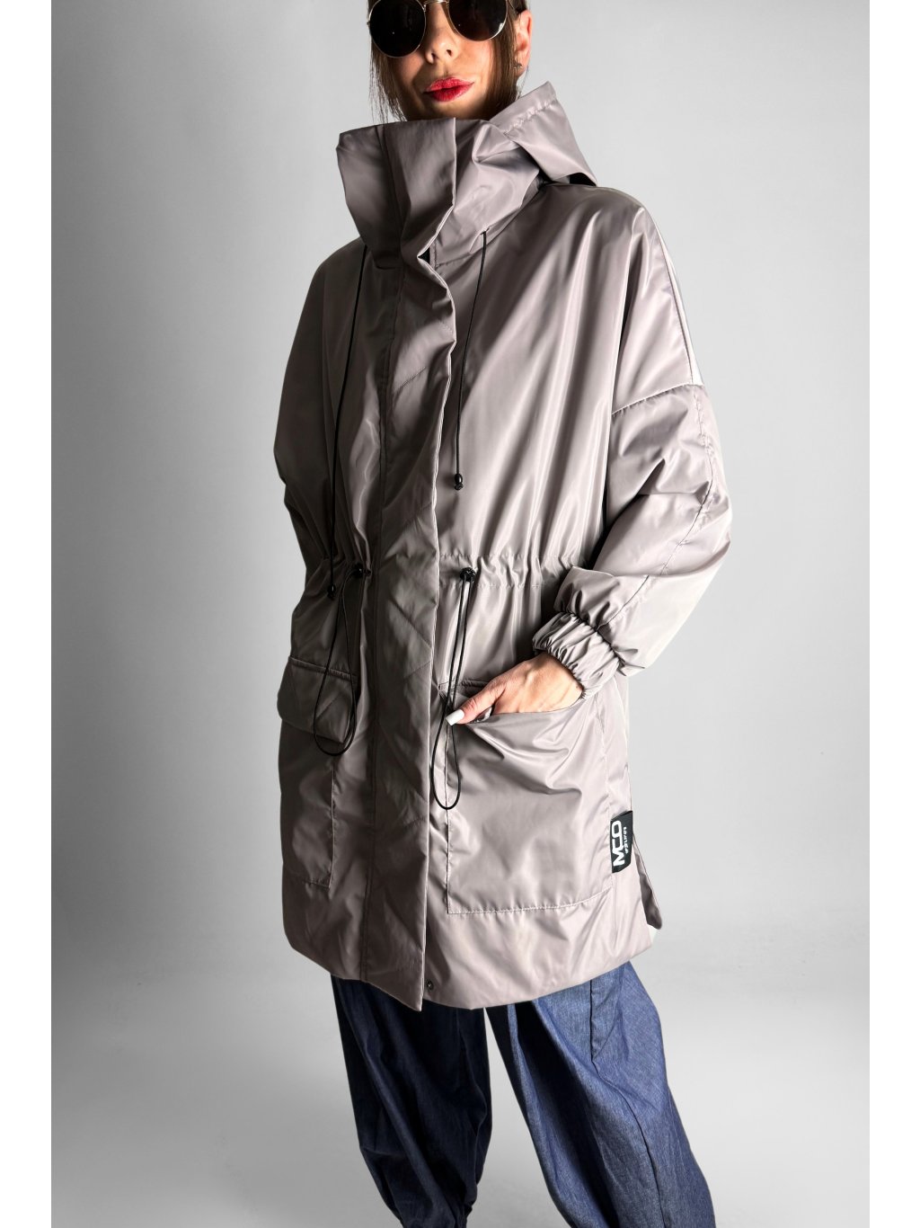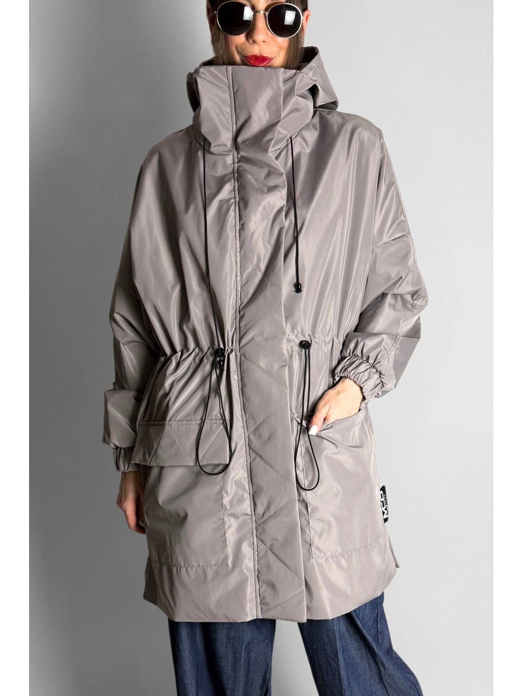 Lehká přechodová bunda s kapucí, vysokým stojáčkem a stahováním v pase na gumičky. Zapínání na zip, kapsy se sklopnou klopou a lehkým prošíváním. Manžety na rukávech jsou elastické, zakončené do gumy. Na zádech a na boku je logo ve stylu mozaiky/mramoru. Spadlá ramena a netopýří rukávy dodávají volný střih.