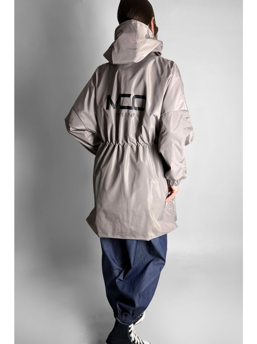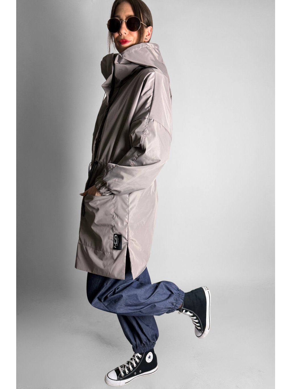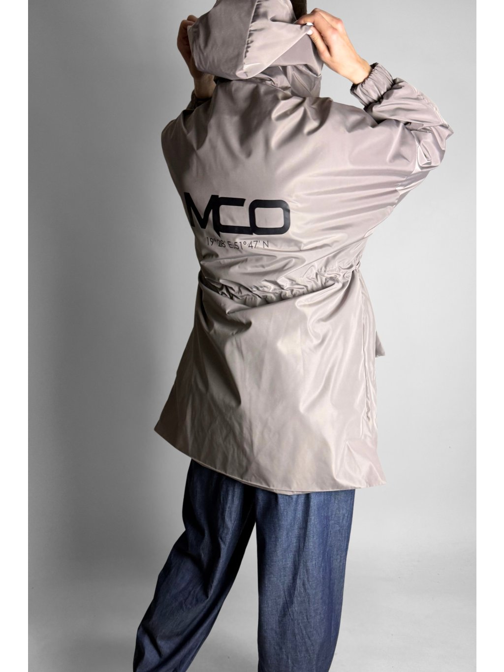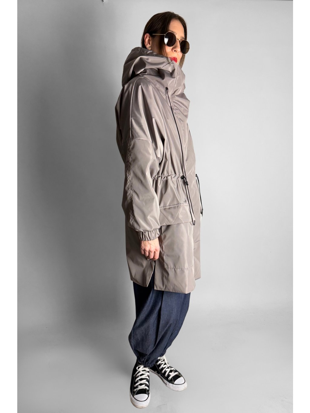 Lehká přechodová bunda s kapucí, vysokým stojáčkem a stahováním v pase na gumičky. Zapínání na zip, kapsy se sklopnou klopou a lehkým prošíváním. Manžety na rukávech jsou elastické, zakončené do gumy. Na zádech a na boku je logo ve stylu mozaiky/mramoru. Spadlá ramena a netopýří rukávy dodávají volný střih.