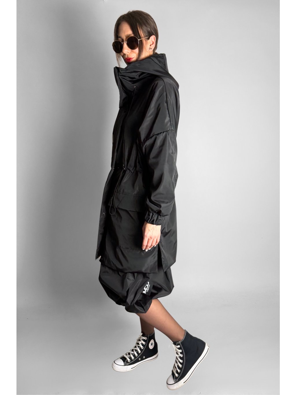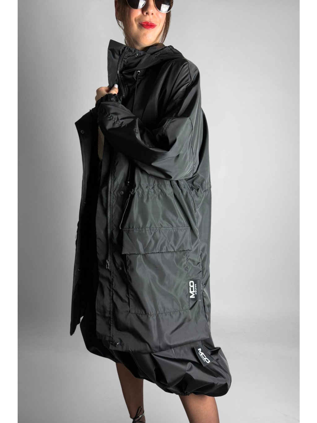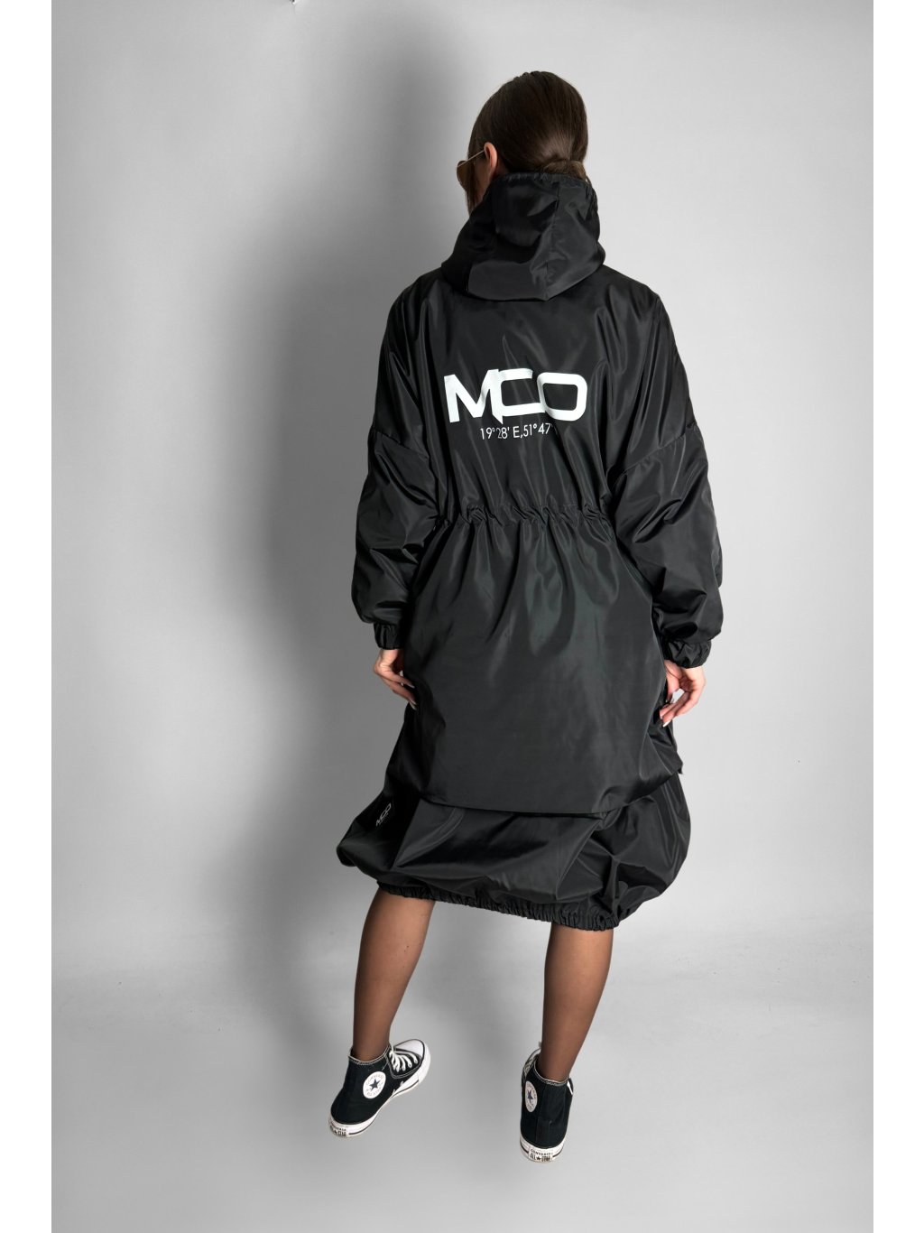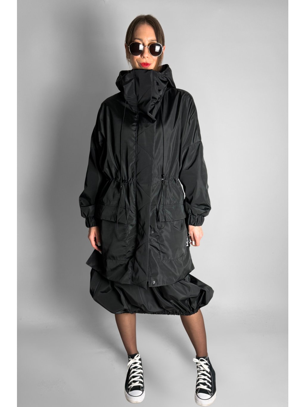 Lehká přechodová bunda s kapucí, vysokým stojáčkem a stahováním v pase na gumičky. Zapínání na zip, kapsy se sklopnou klopou a lehkým prošíváním. Manžety na rukávech jsou elastické, zakončené do gumy. Na zádech a na boku je logo ve stylu mozaiky/mramoru. Spadlá ramena a netopýří rukávy dodávají volný střih.