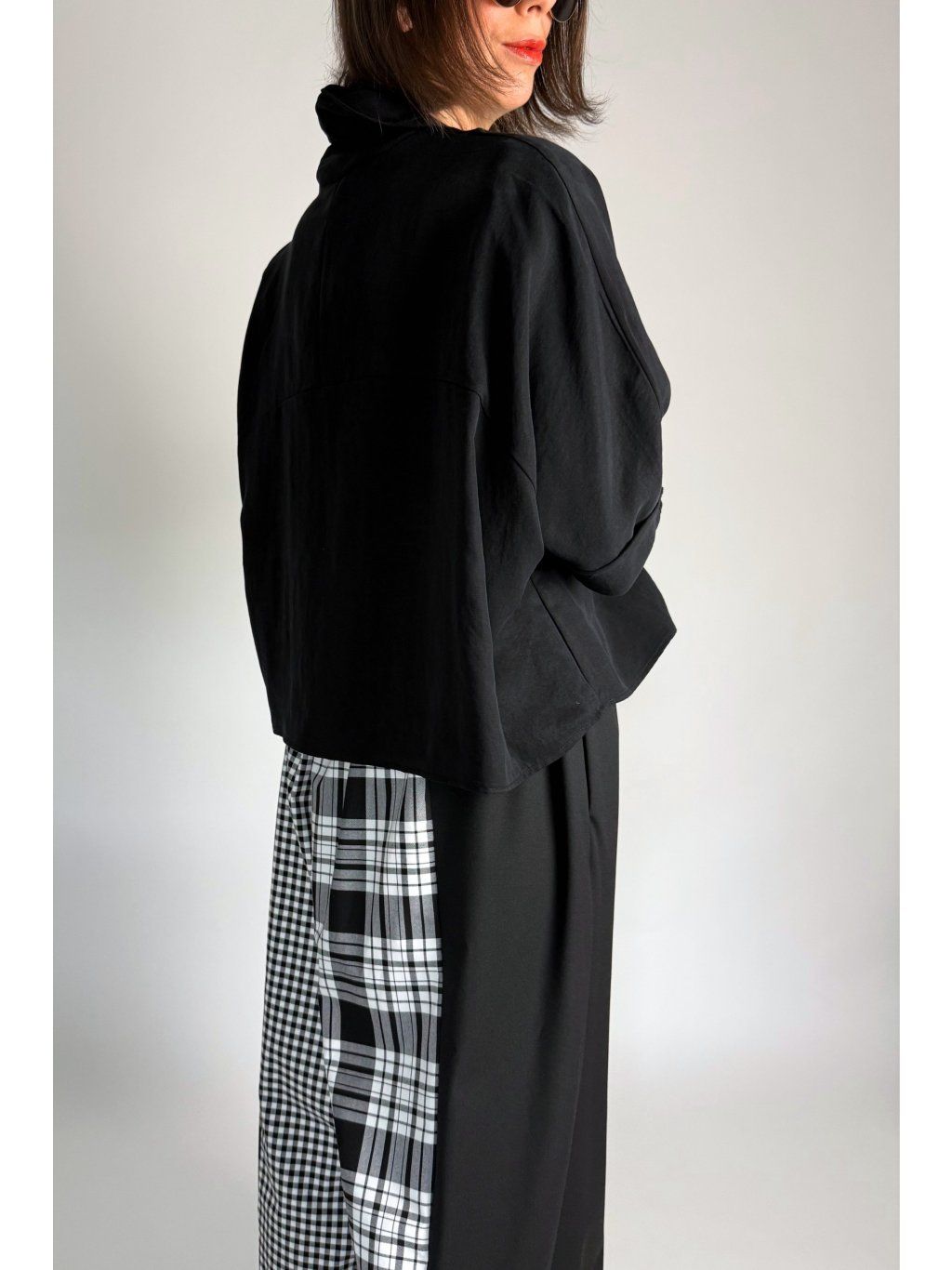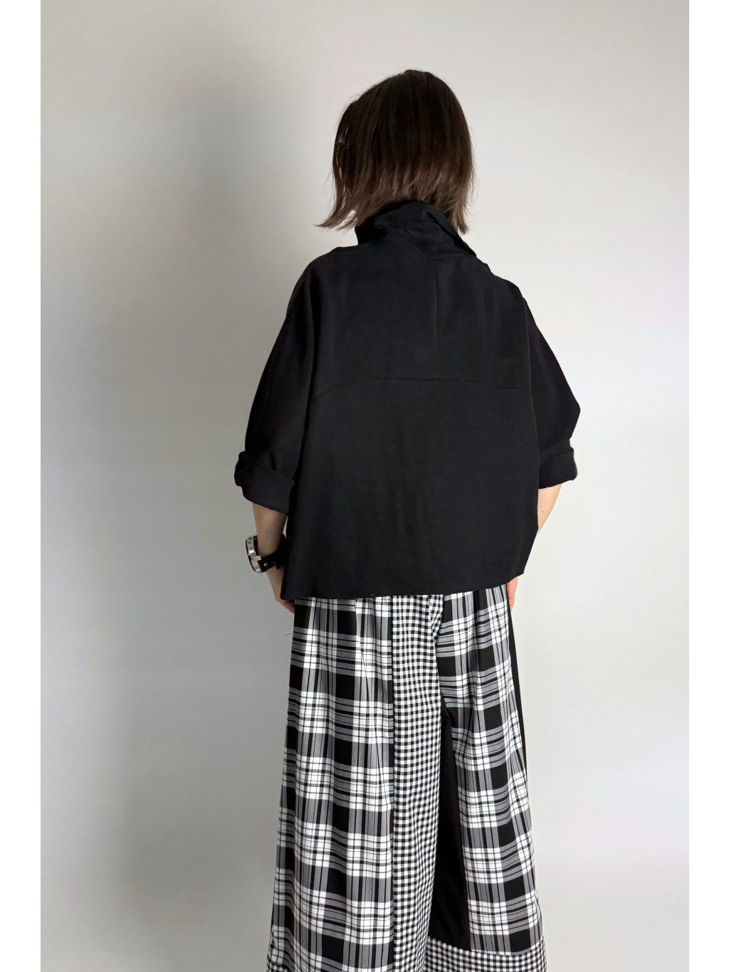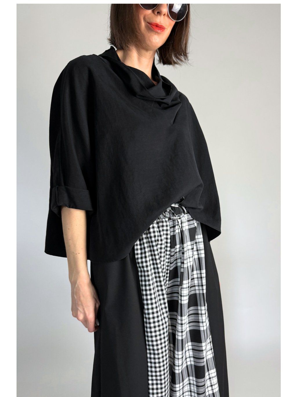 Lehká halenka s vyšším stojáčkem, který je volně spadlý a vytváří jemný rolákový efekt.