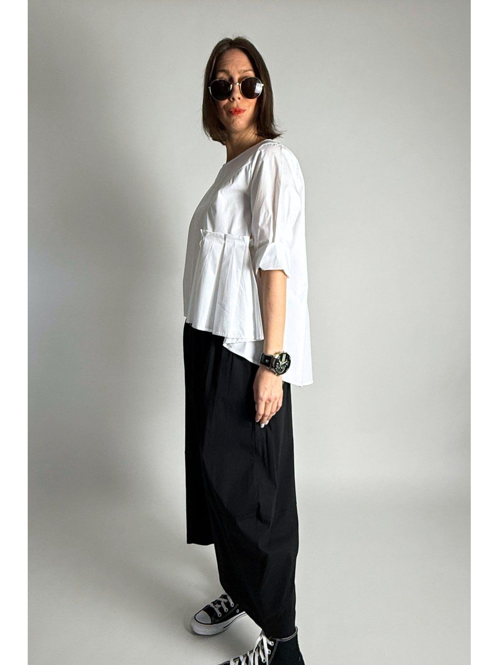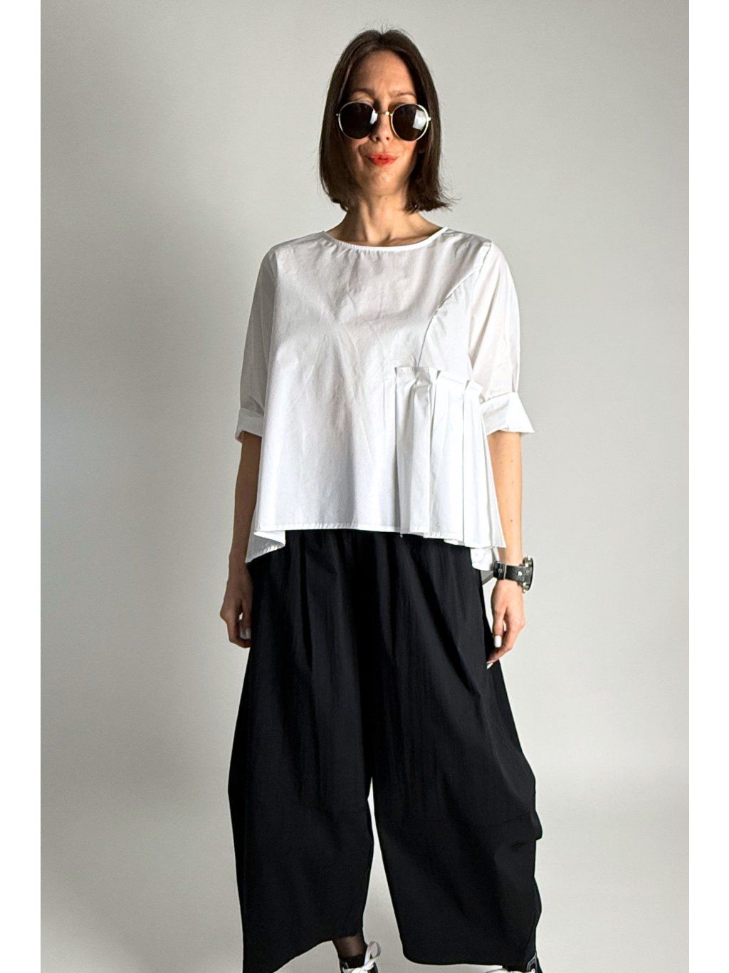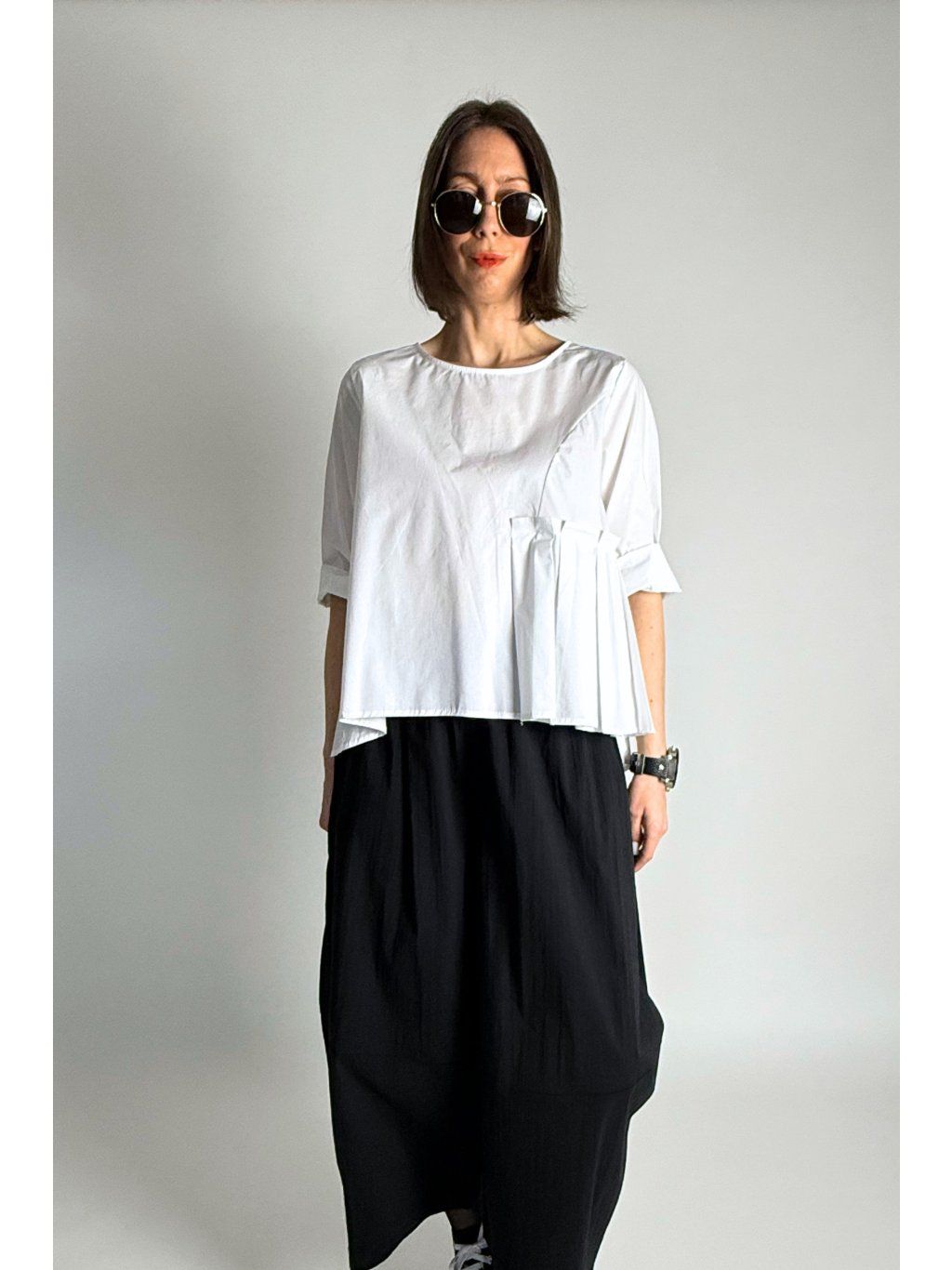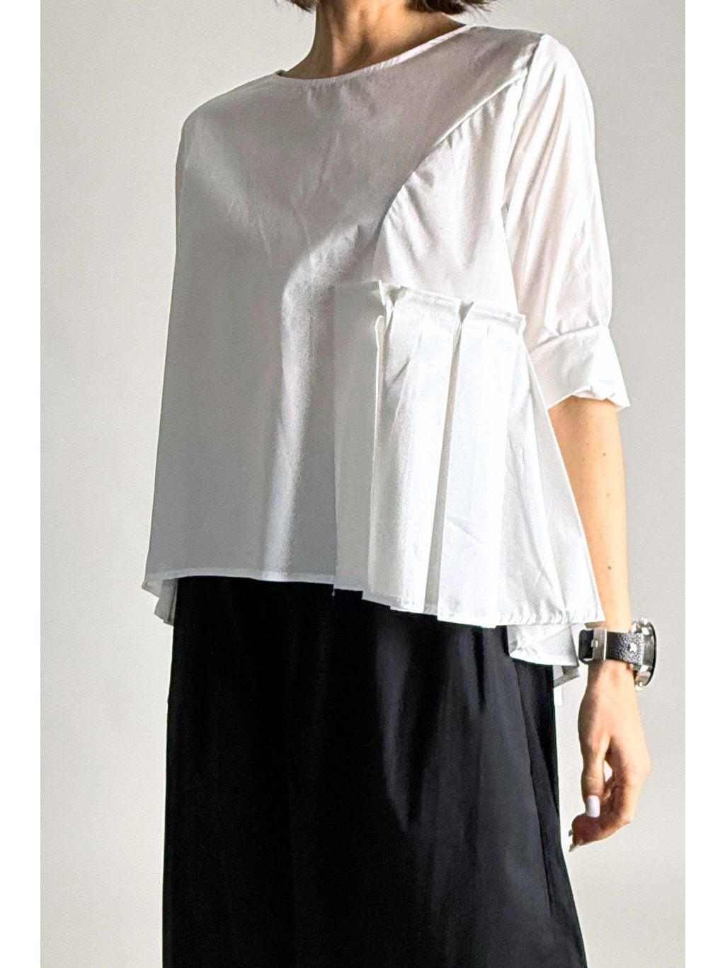 Lehká halenka s výrazným detailem skladů na levé straně, které vytvářejí zajímavý efekt podobný harmonice. Zadní díl je doplněný o jemný sklad.