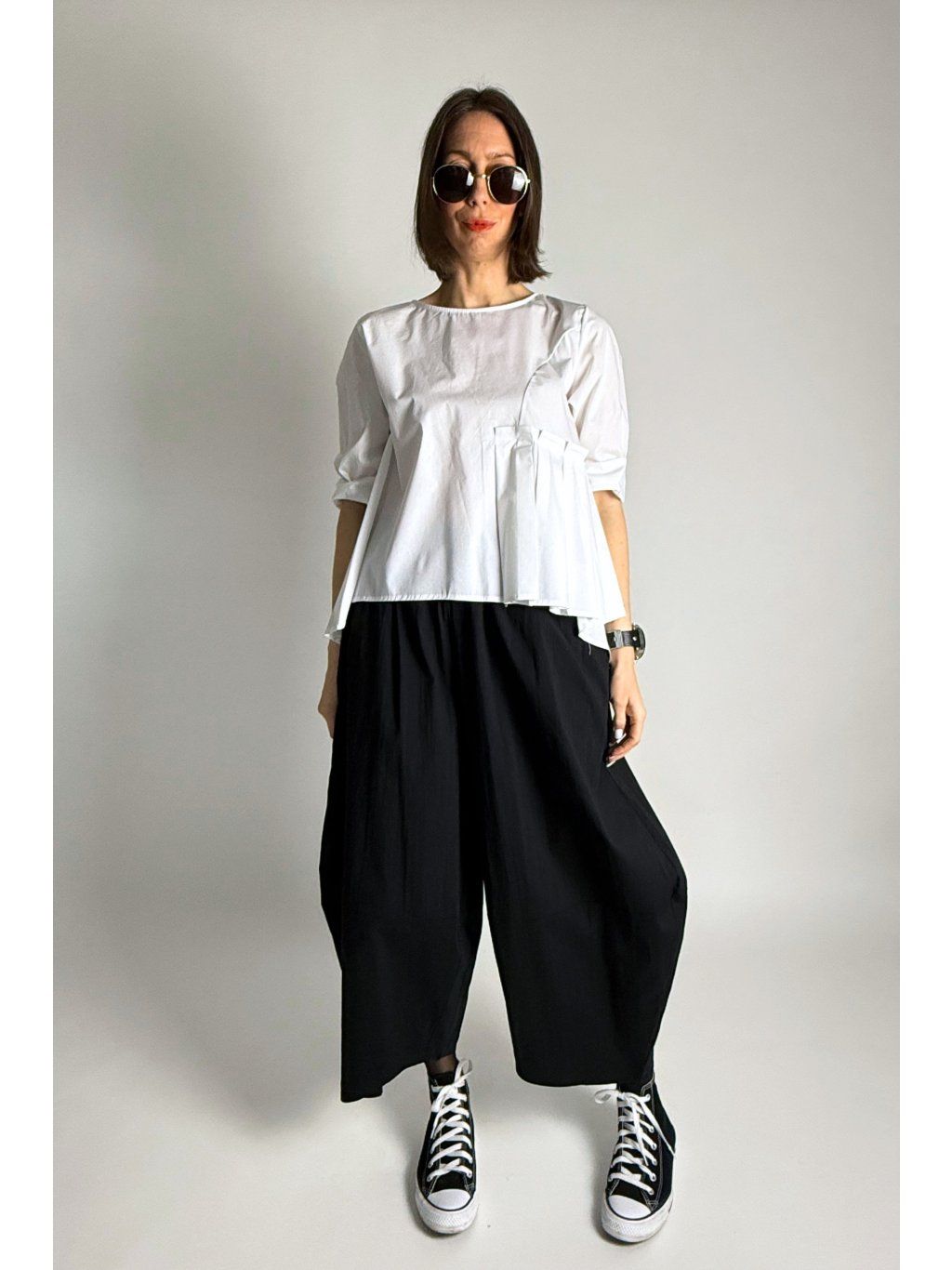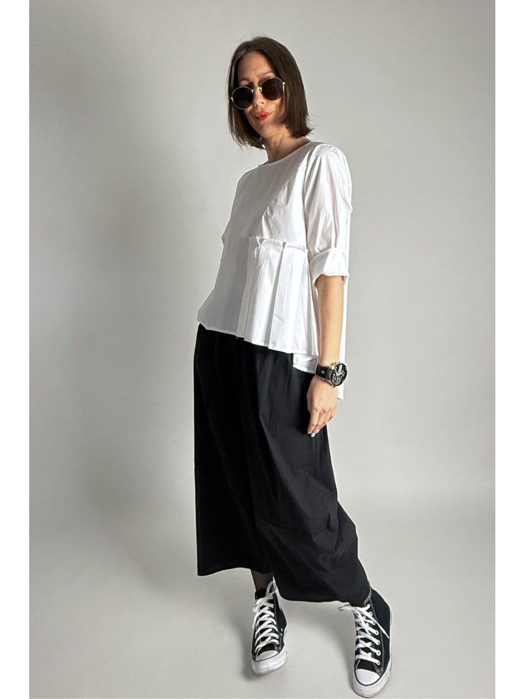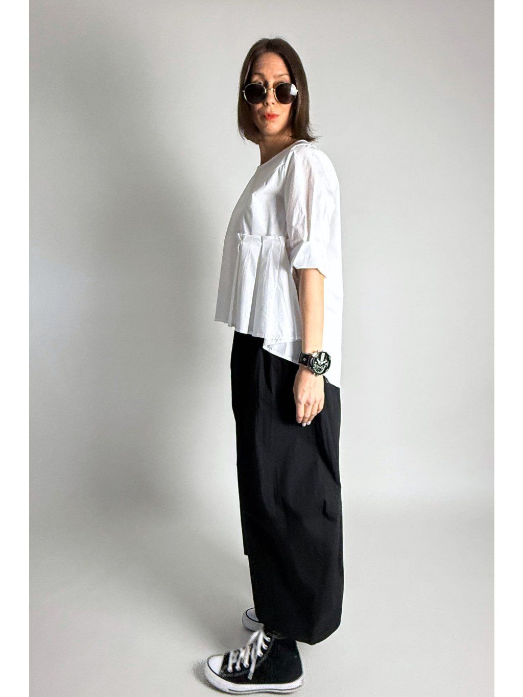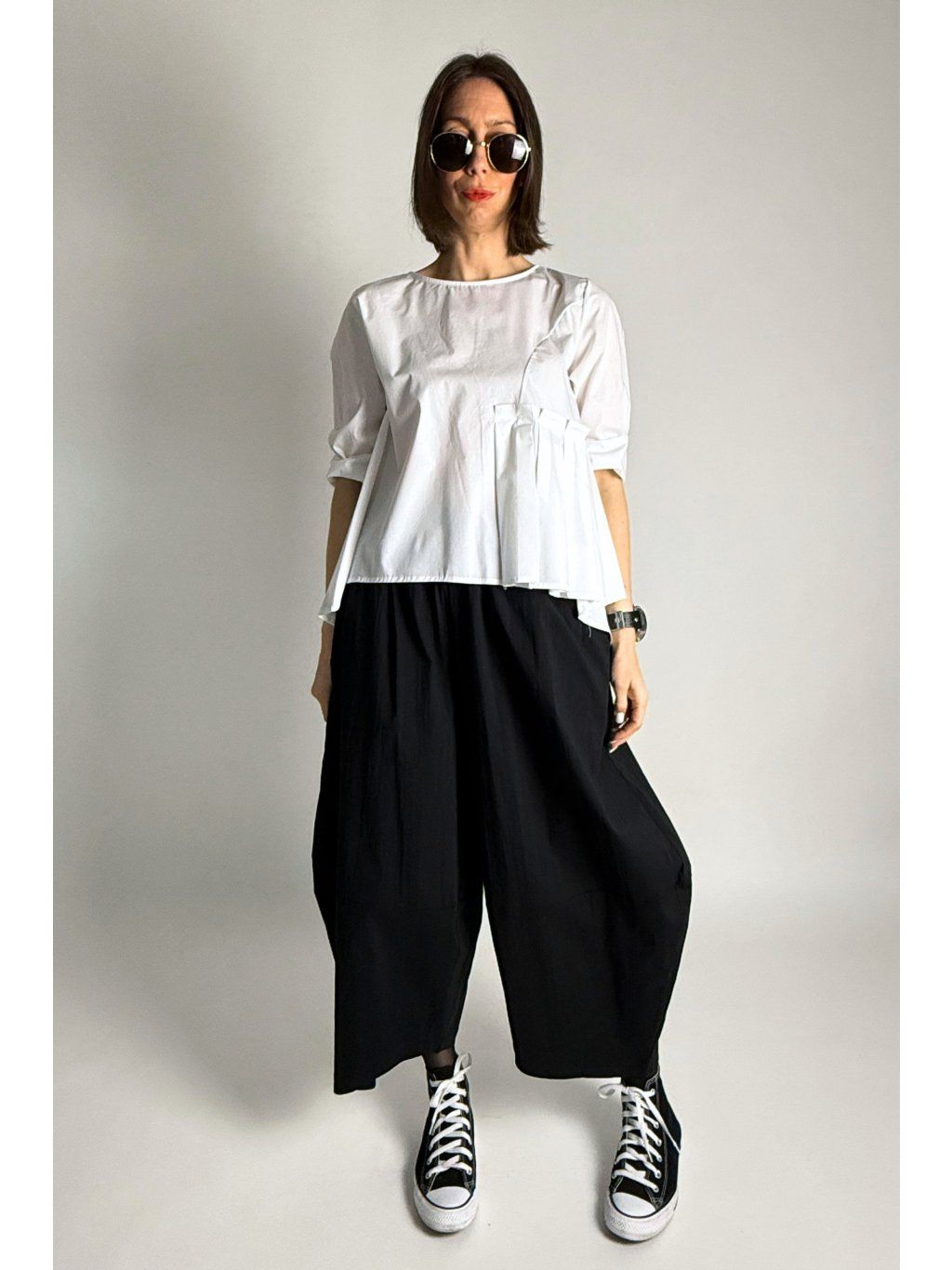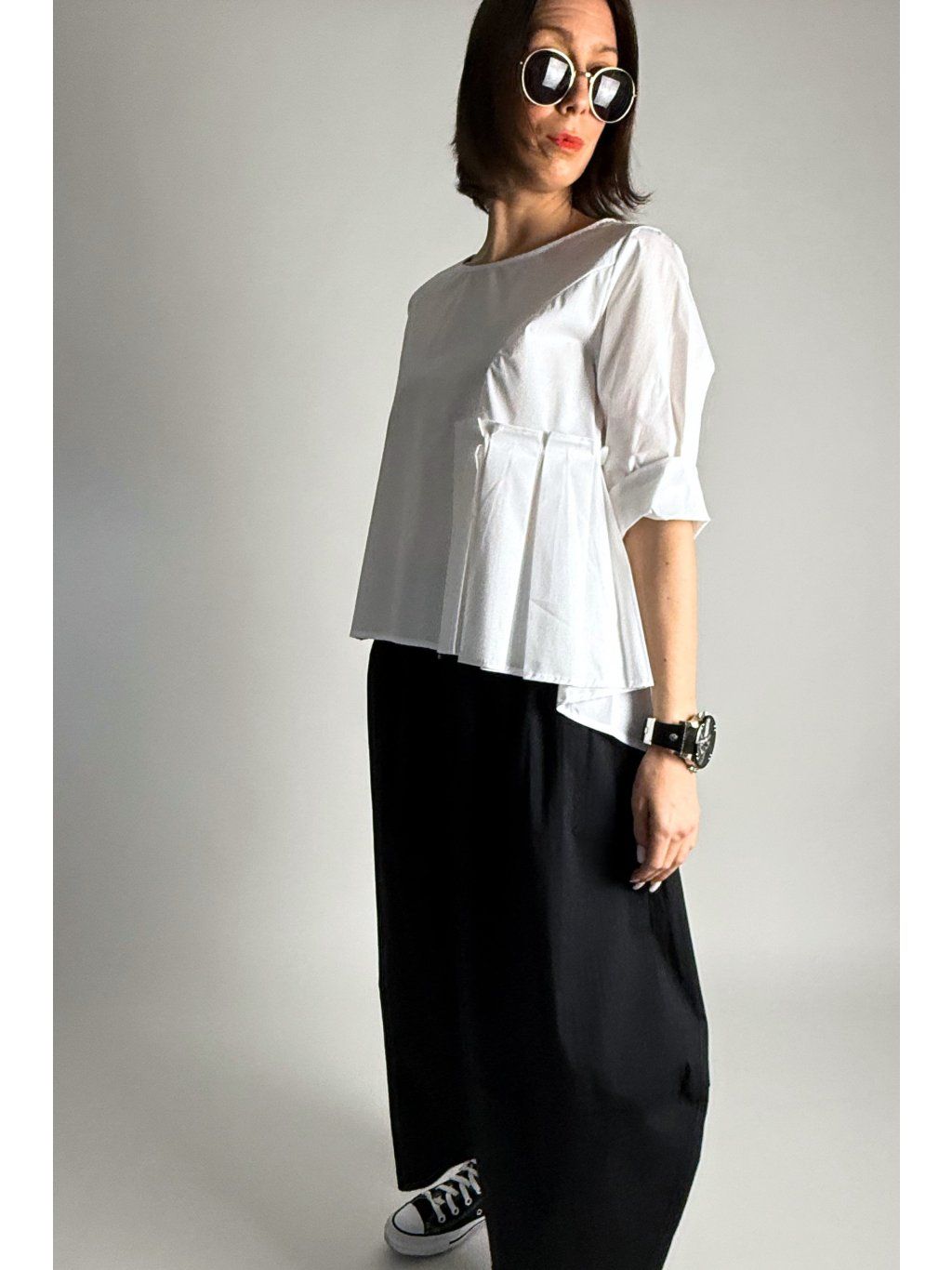 Lehká halenka s výrazným detailem skladů na levé straně, které vytvářejí zajímavý efekt podobný harmonice. Zadní díl je doplněný o jemný sklad.