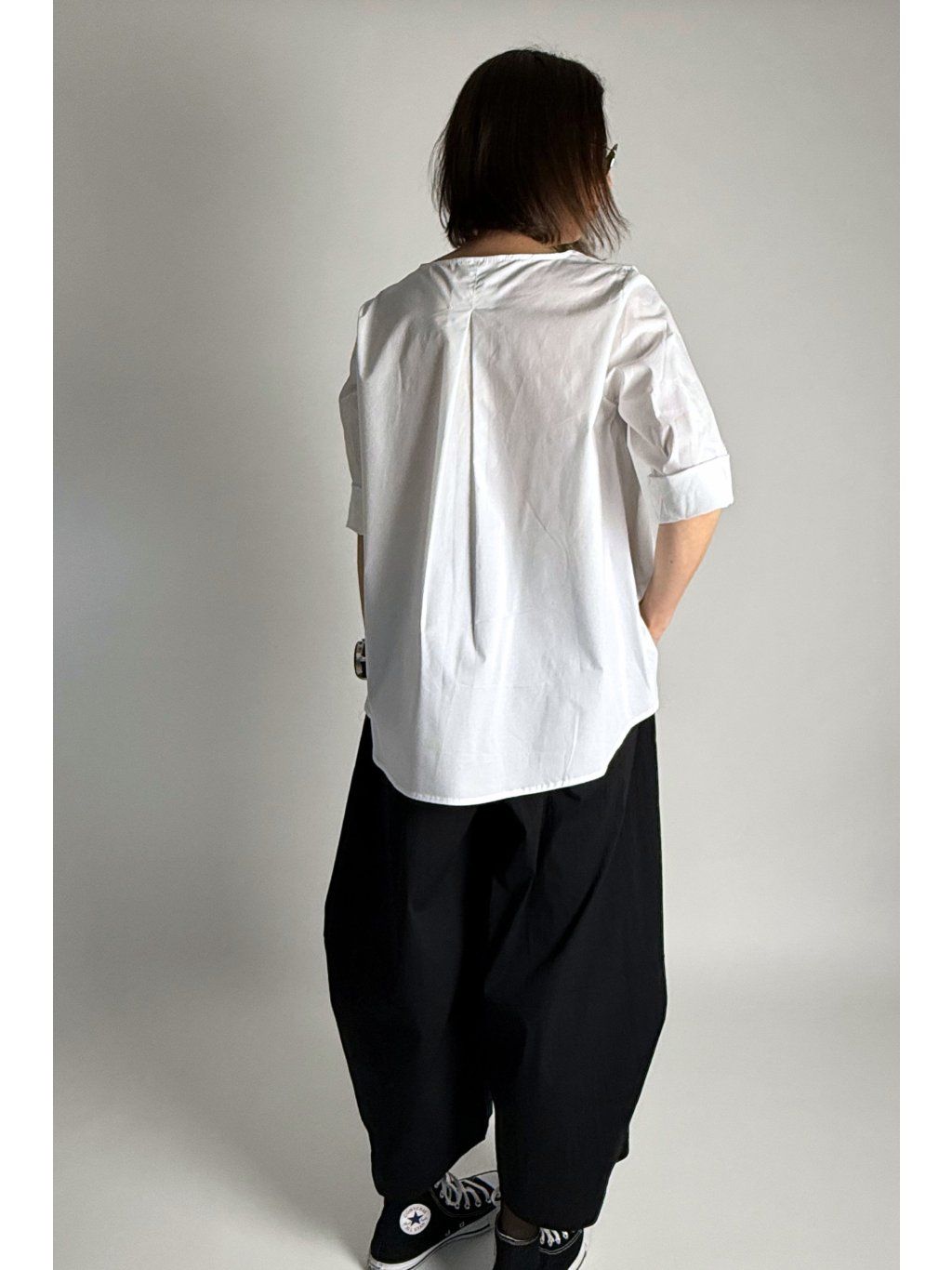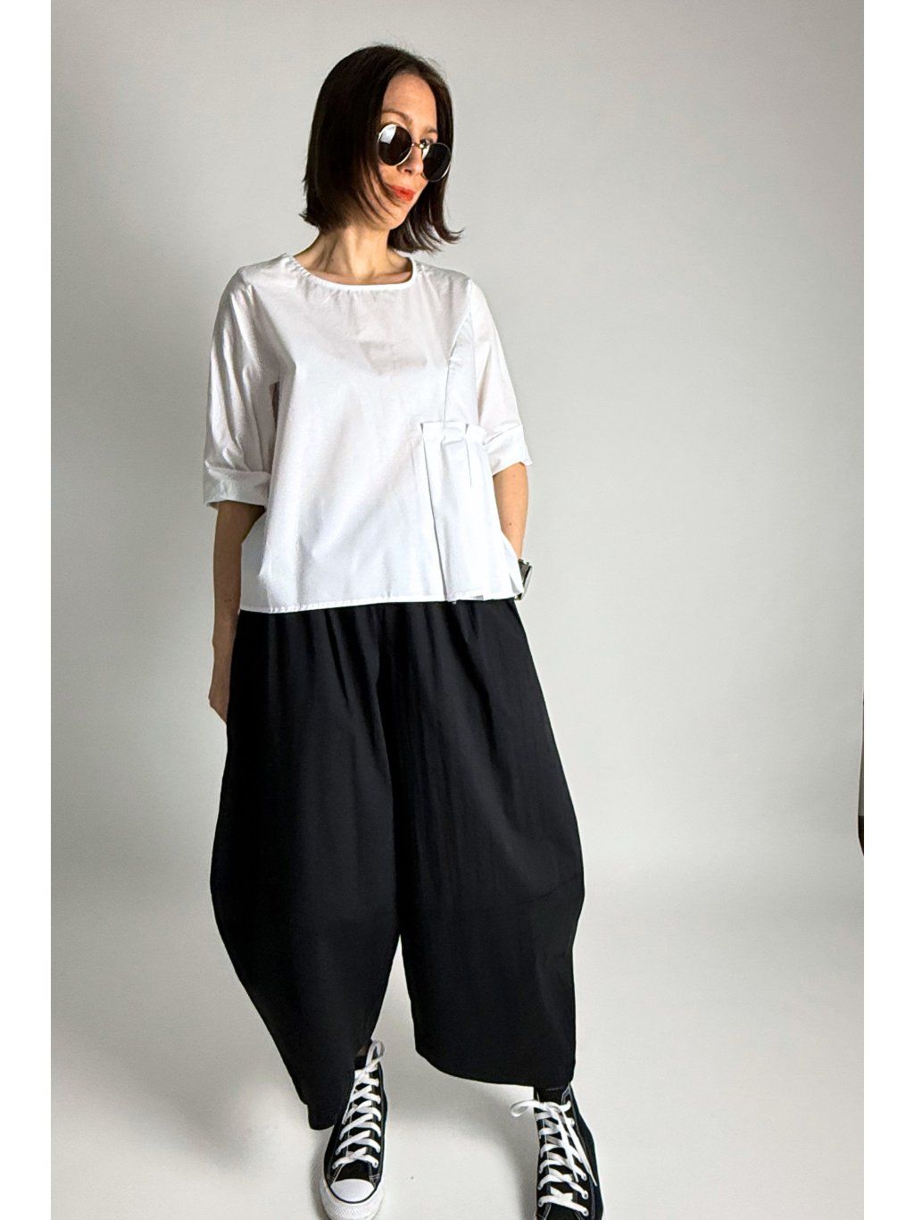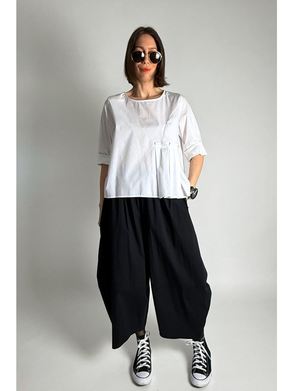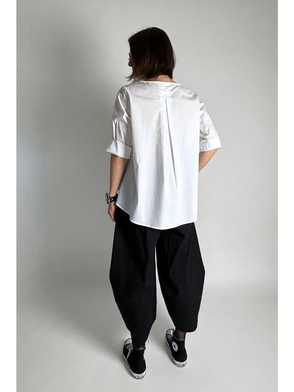 Lehká halenka s výrazným detailem skladů na levé straně, které vytvářejí zajímavý efekt podobný harmonice. Zadní díl je doplněný o jemný sklad.