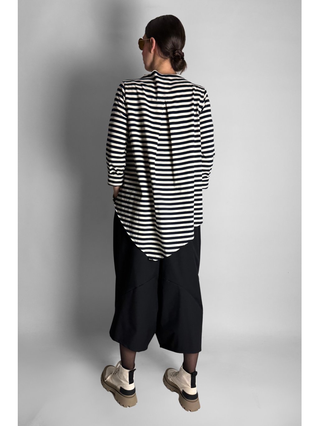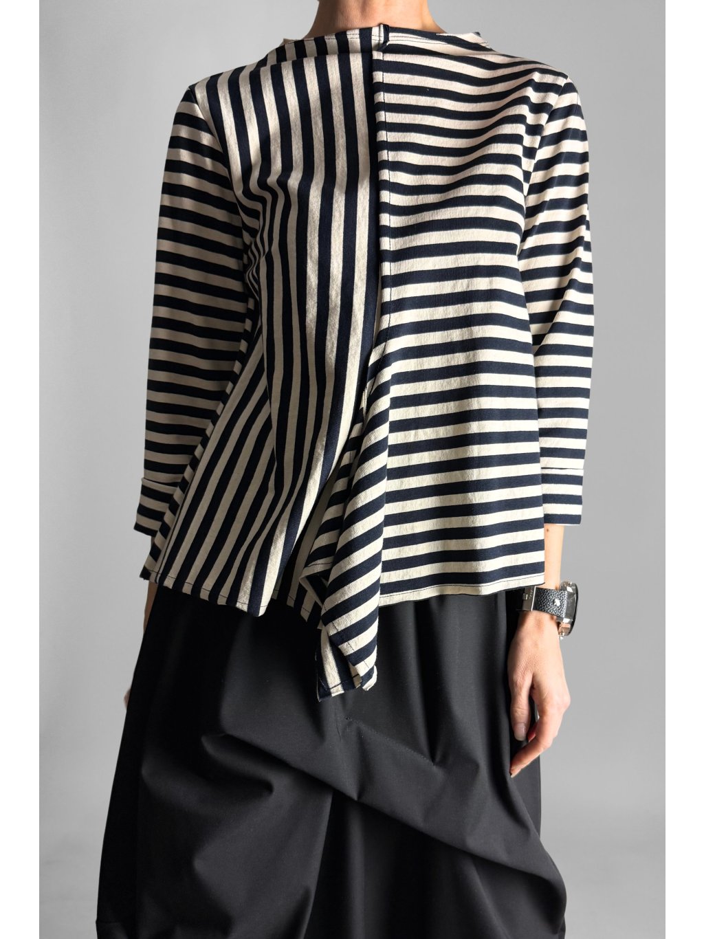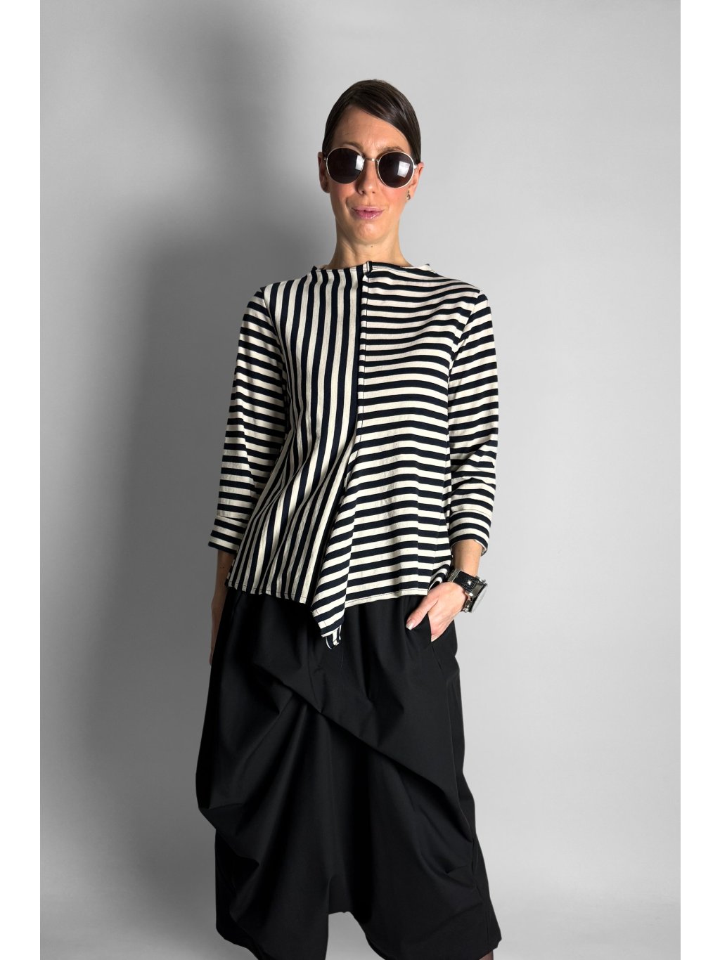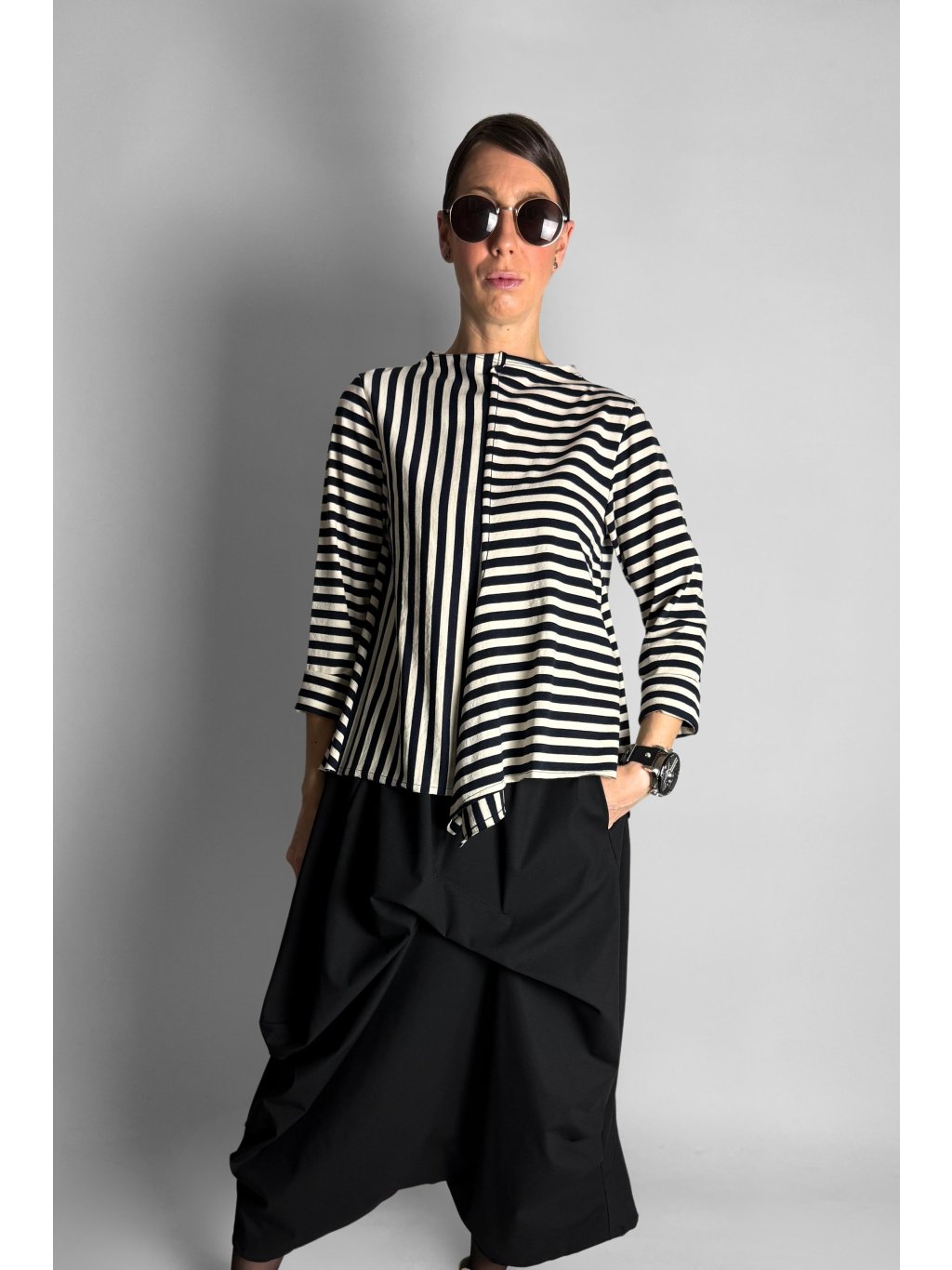 Lehká proužkovaná halenka ze 100% bavlny, která zaujme kombinací svislých i vodorovných pruhů. Tento detail vytváří zajímavý vizuální efekt a dodává modelu moderní charakter.