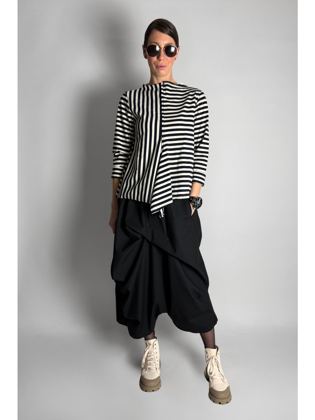 Halenka má pohodlný střih s delšími rukávy a asymetrickým předním dílem..