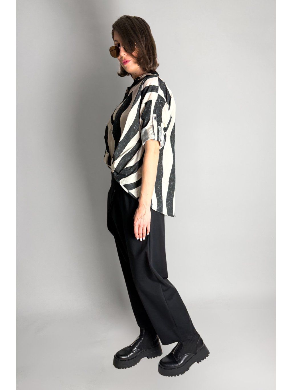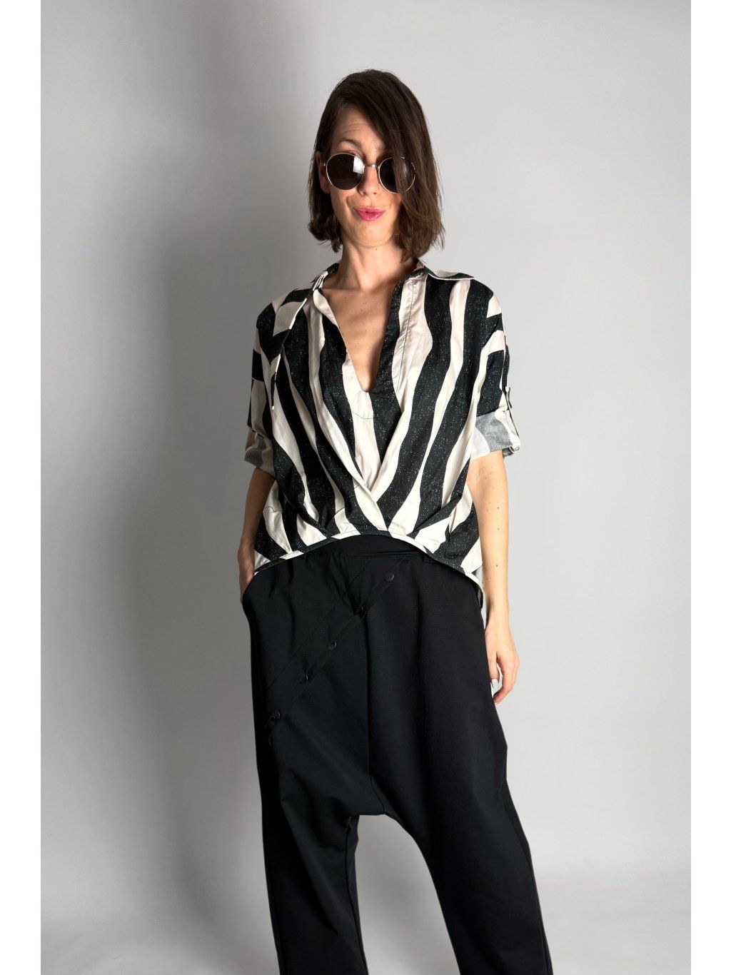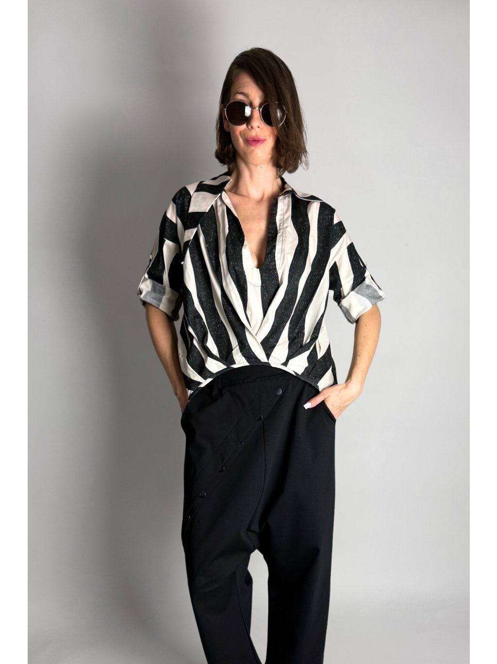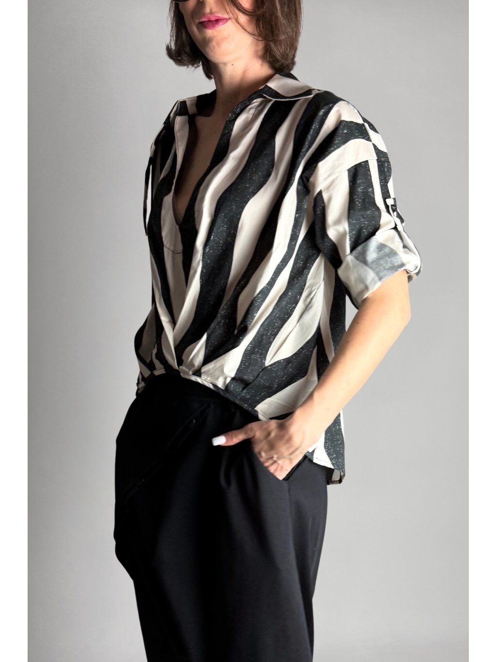 Lehká halenka se zebrovaným vzorem a asymetrickým límečkem.