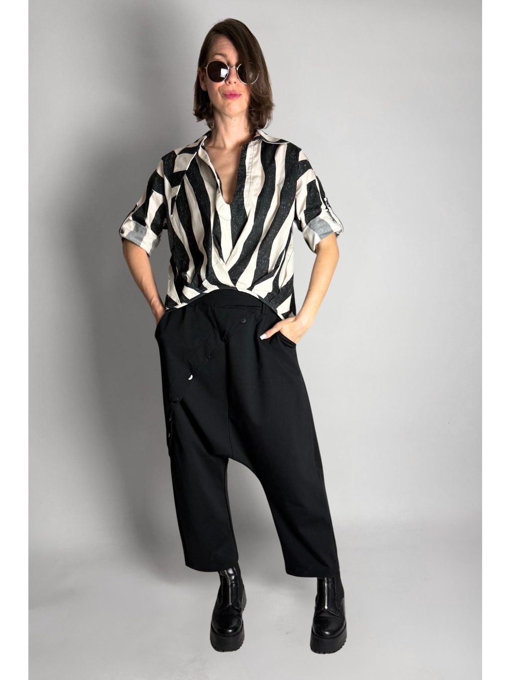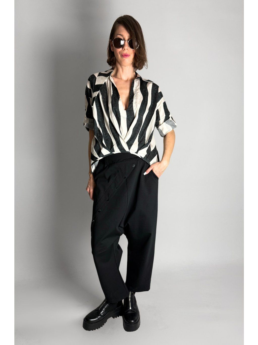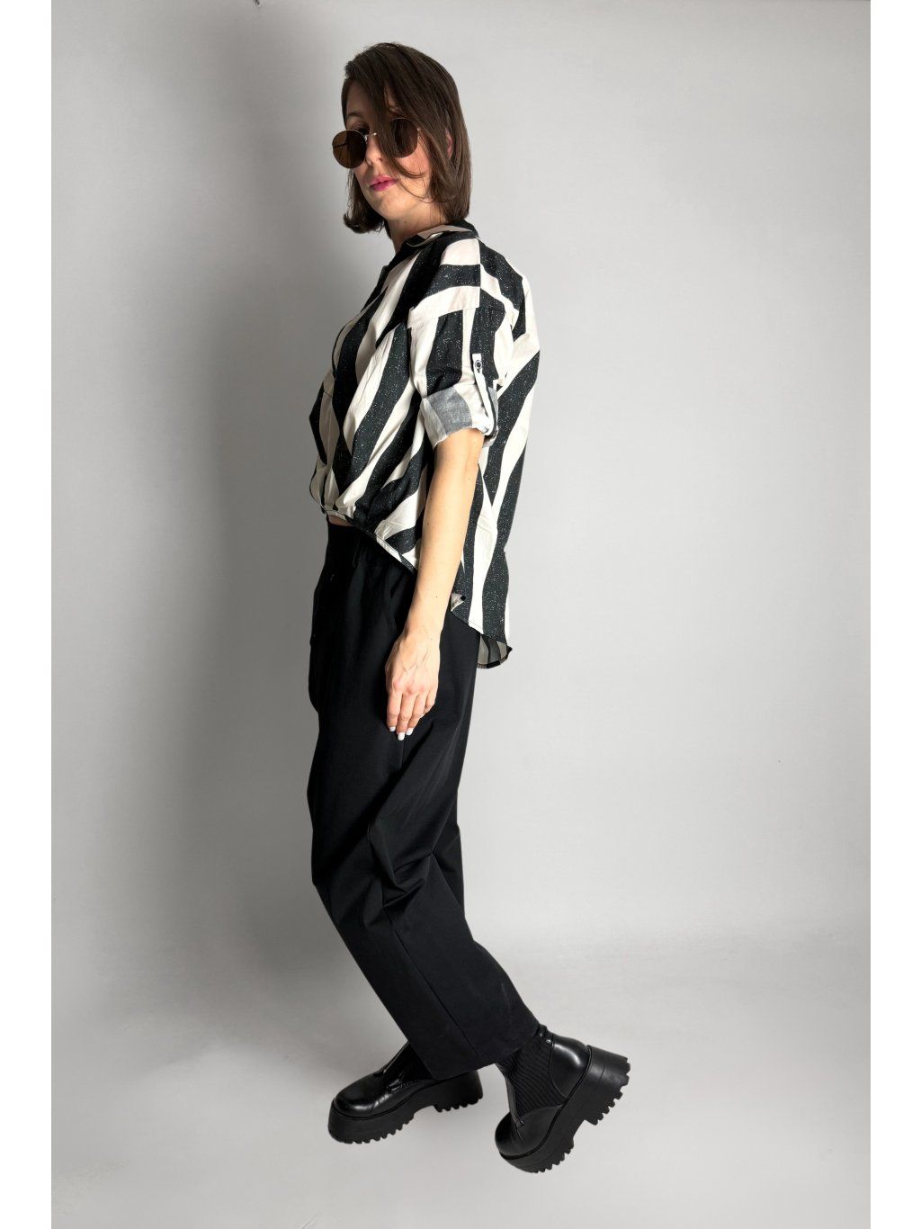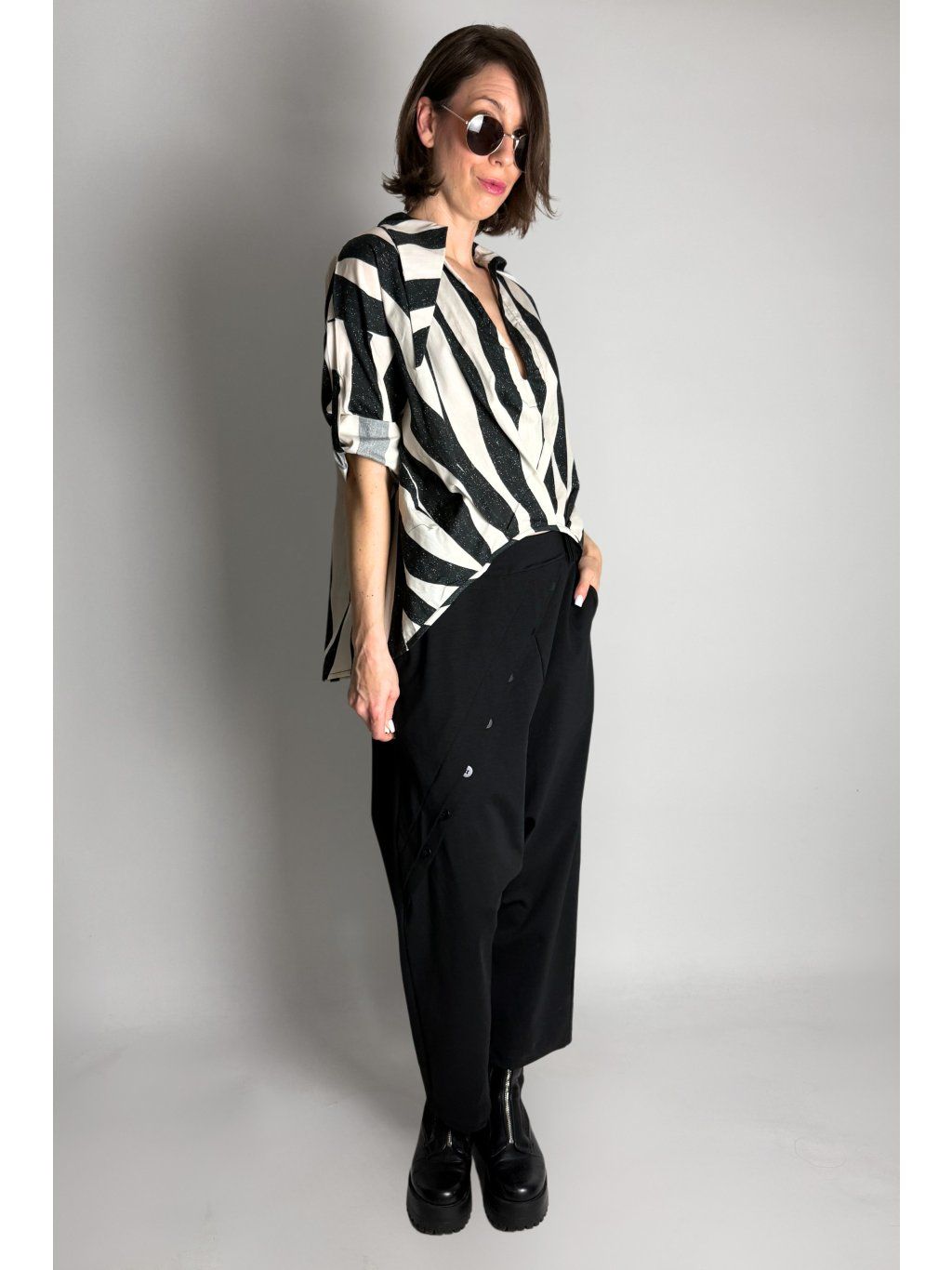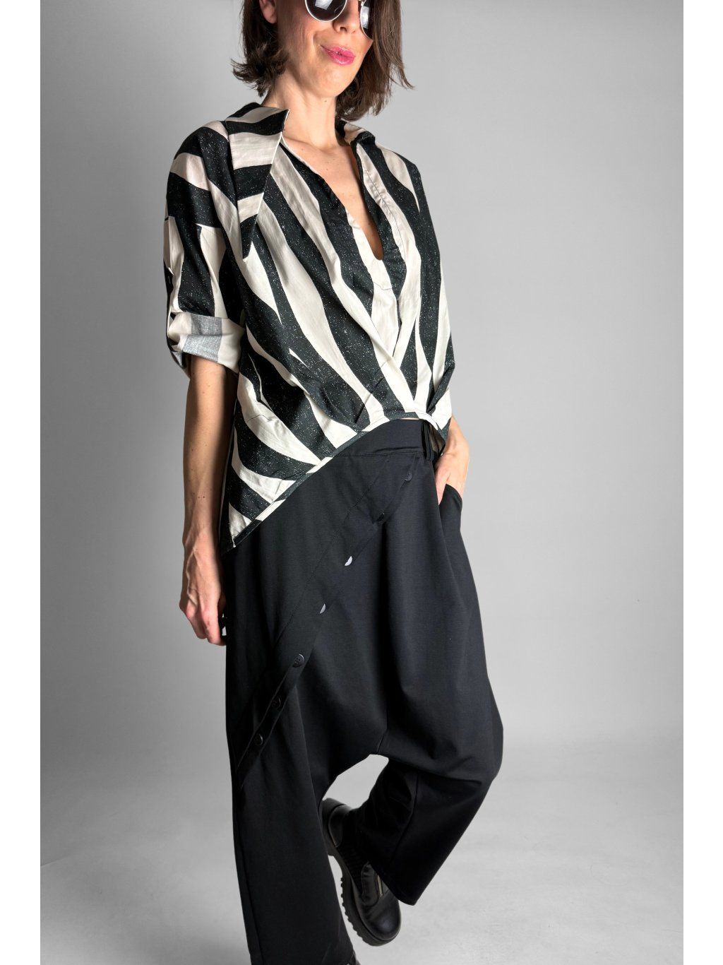 Lehká halenka se zebrovaným vzorem a asymetrickým límečkem.