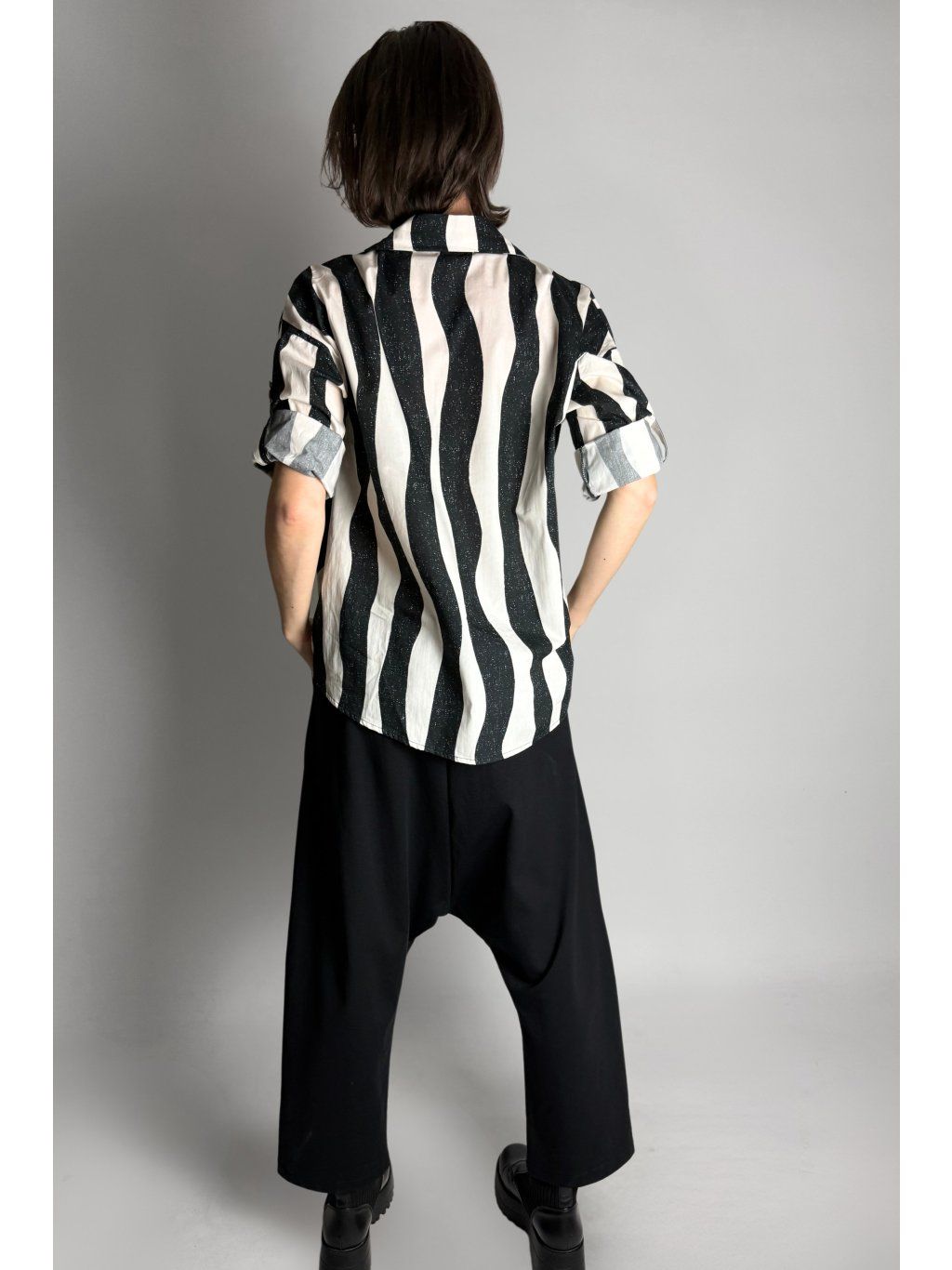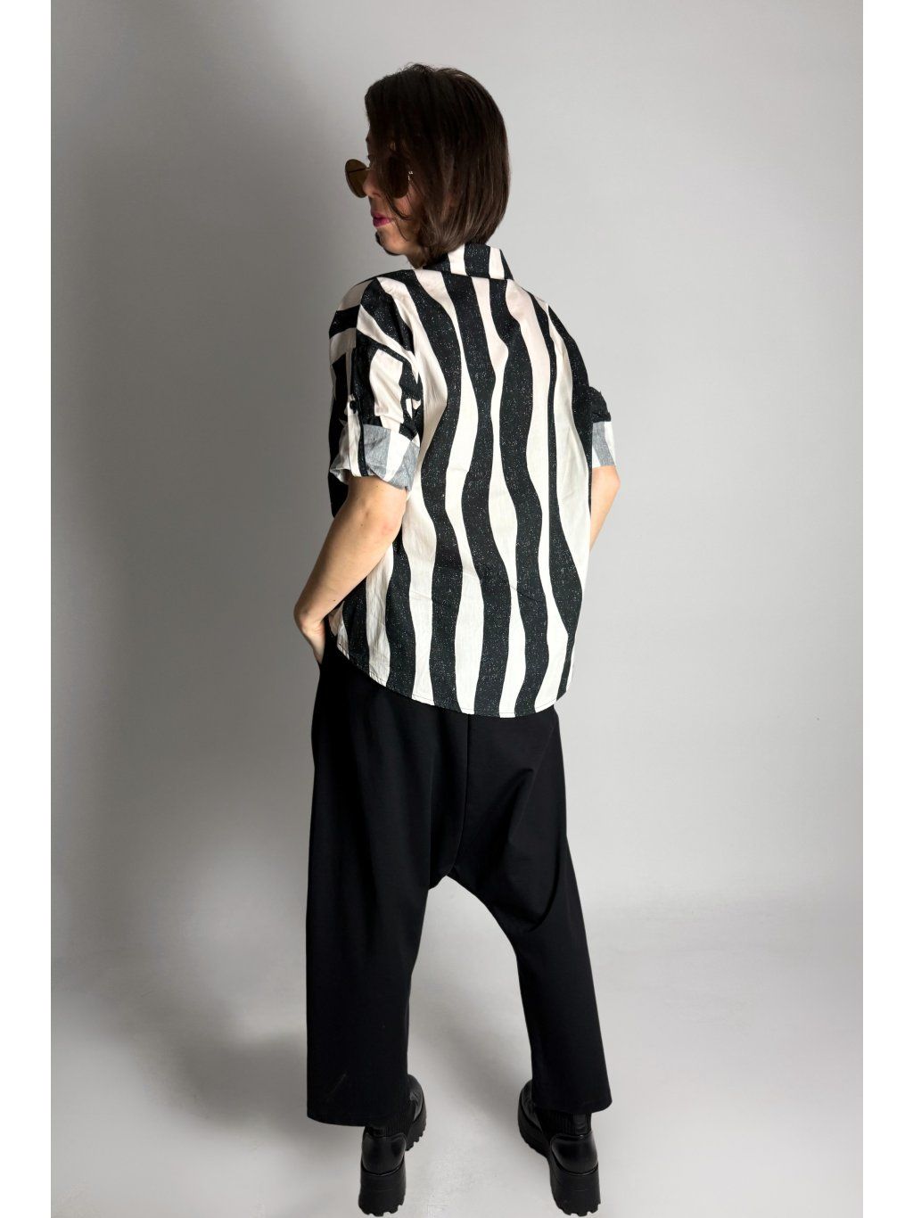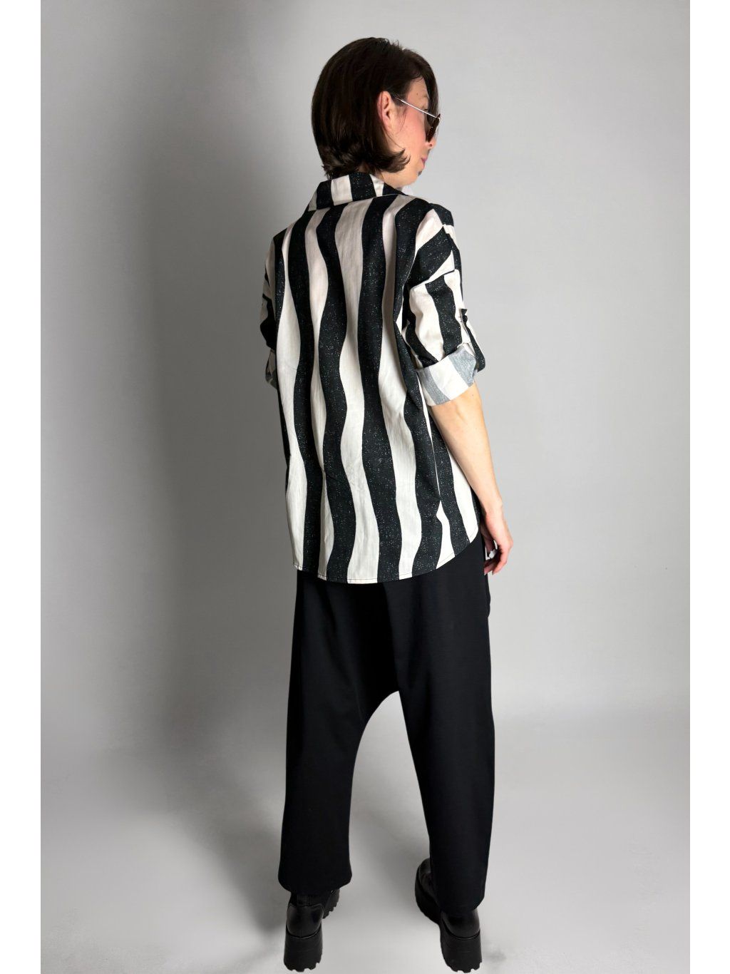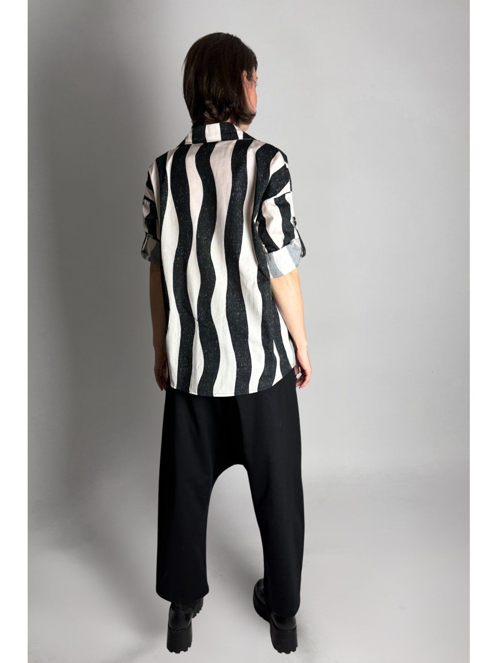 Lehká halenka se zebrovaným vzorem a asymetrickým límečkem.