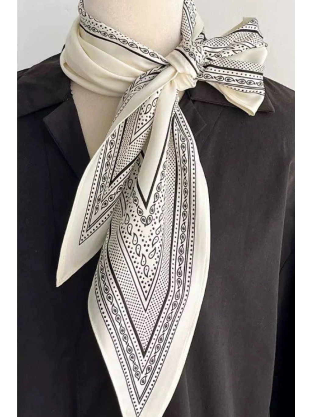 Lehký trojúhelníkový šátek se vzorem, který lze nosit různými způsoby kolem krku, jako doplněk do vlasů, na kabelku nebo přes boky.