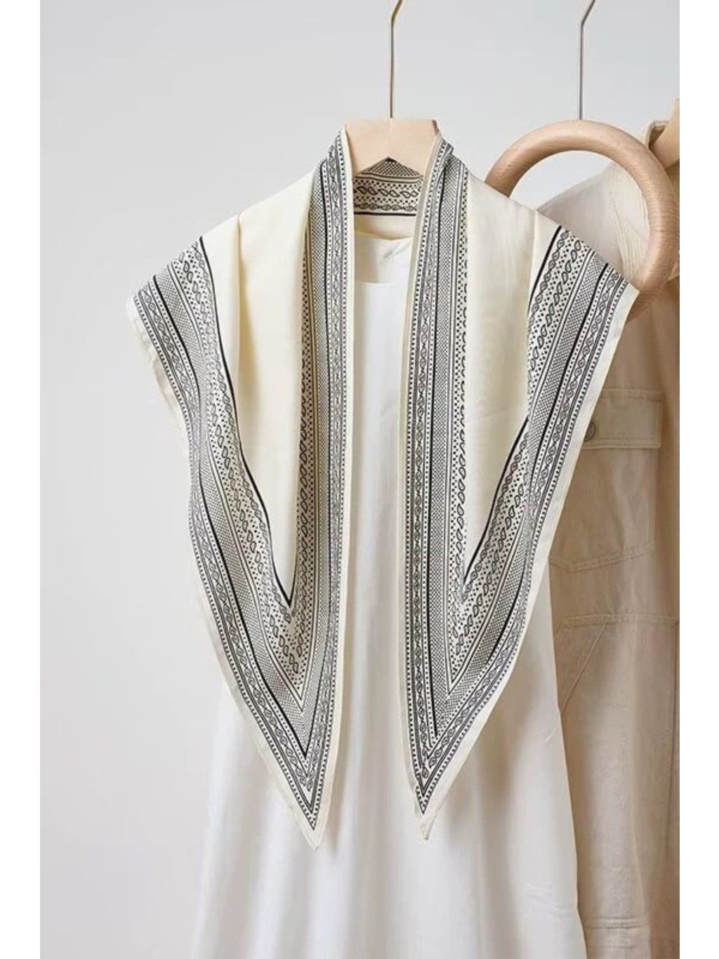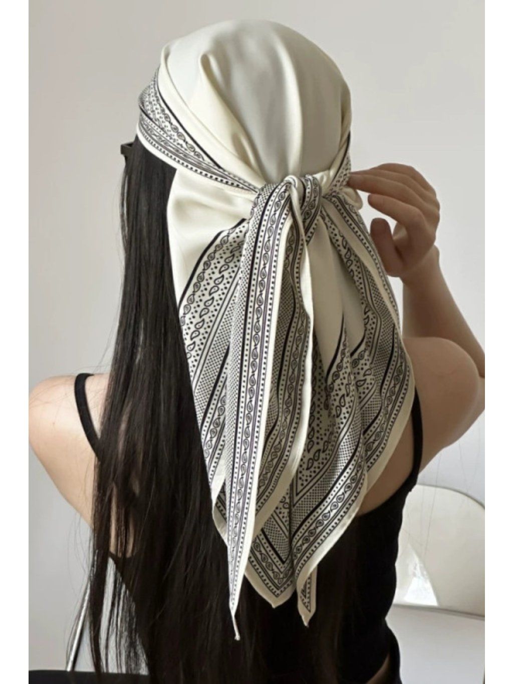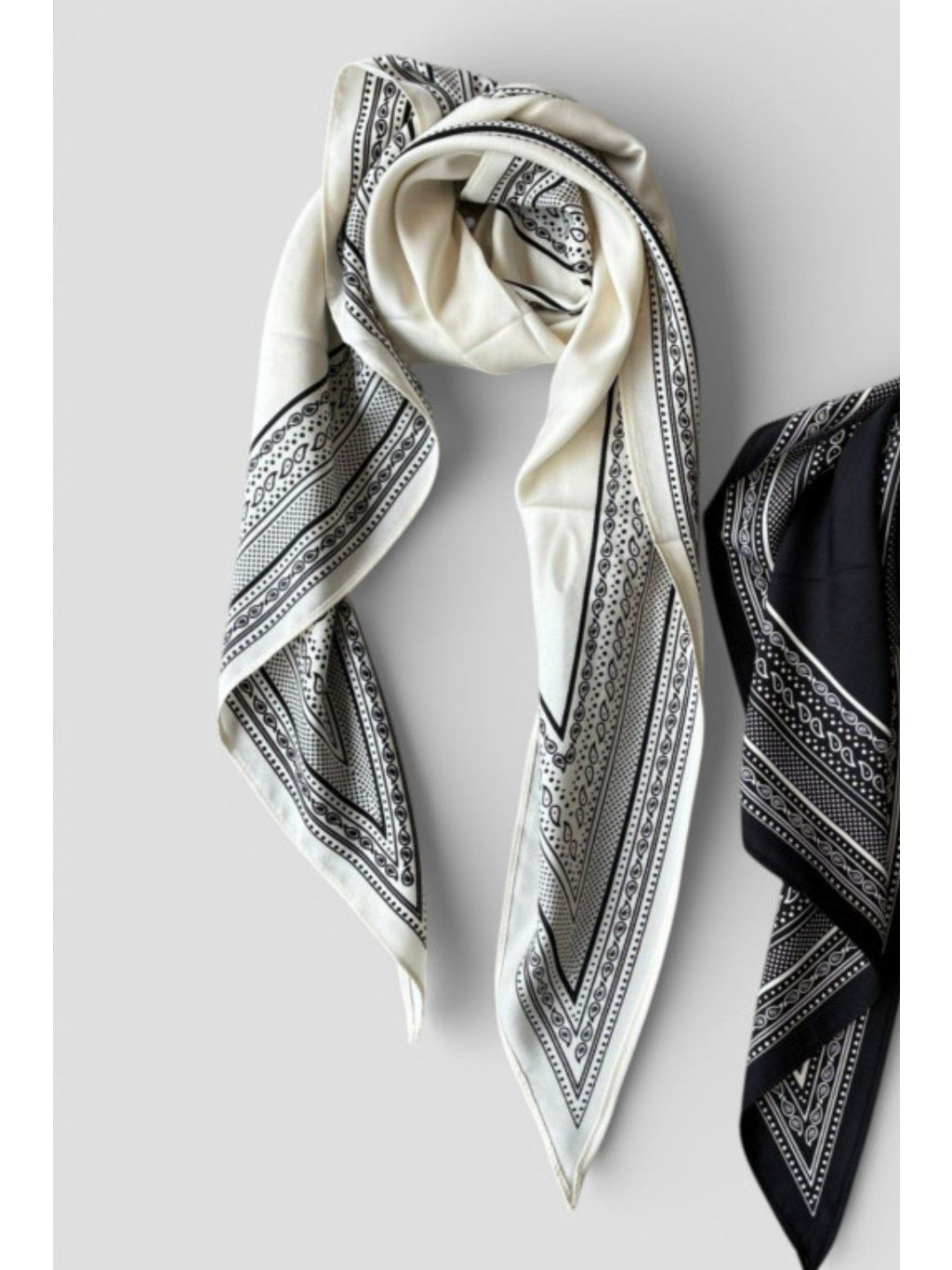 Lehký trojúhelníkový šátek se vzorem, který lze nosit různými způsoby kolem krku, jako doplněk do vlasů, na kabelku nebo přes boky.